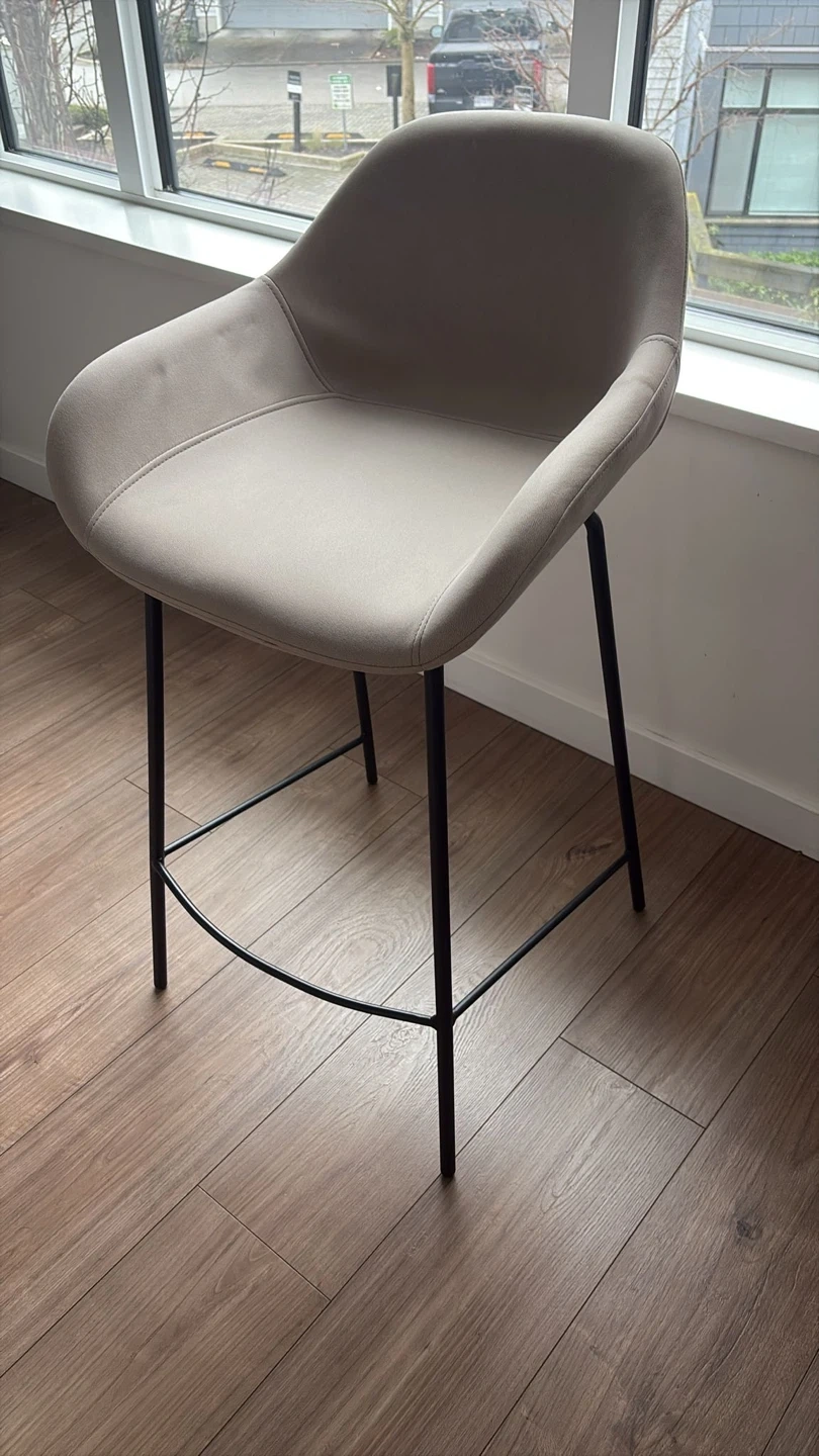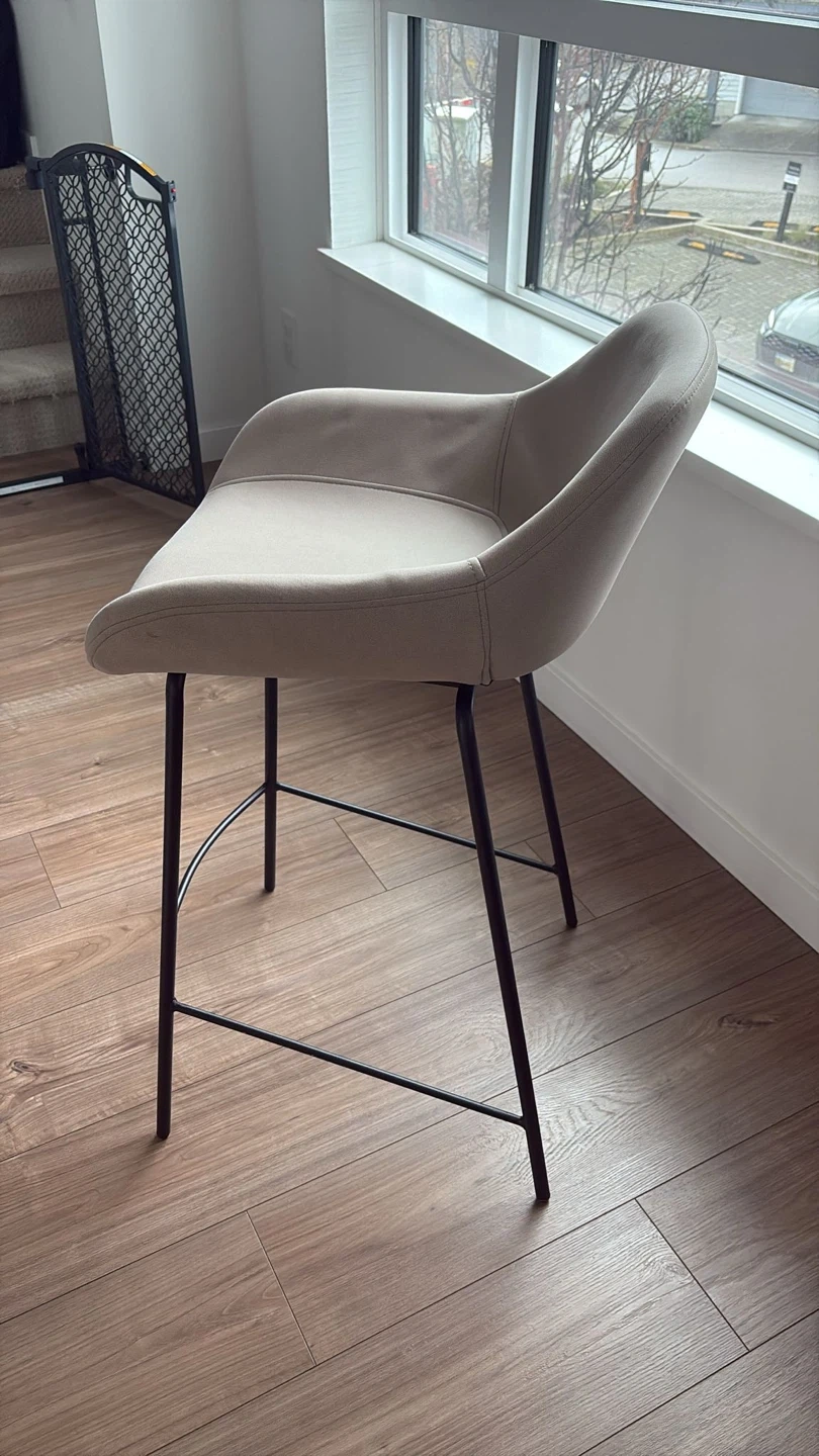 Selling a bar stool from Bouclair in great condition. It features a comfortable beige seat and sleek black legs. Perfect for adding a touch of modern style to your kitchen or bar area.