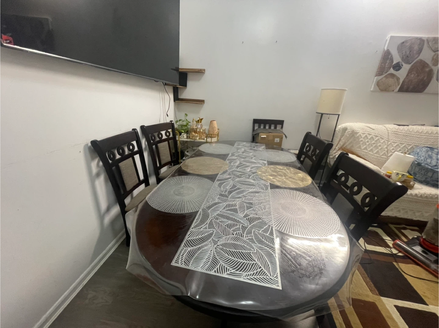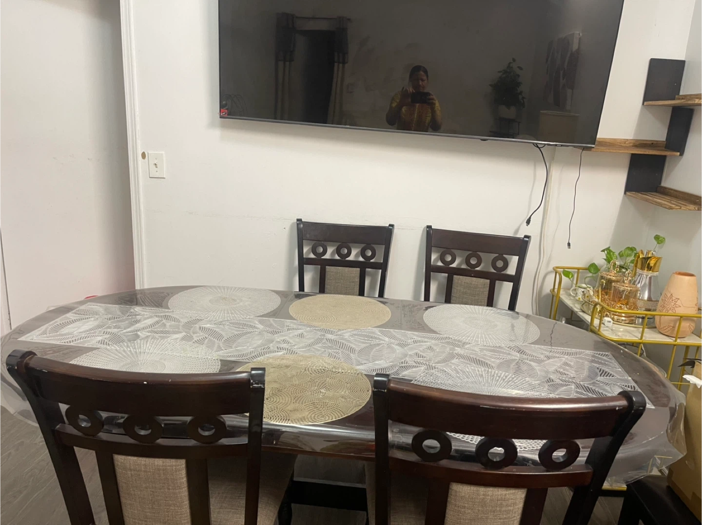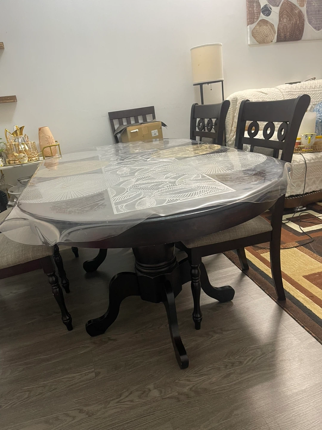 Selling a beautiful oval dining table that comes with six matching chairs. The table has a dark wood finish and a sturdy pedestal base. The chairs have a unique design on the backrests and neutral-colored fabric seats. This set would be a great addition to any dining room!