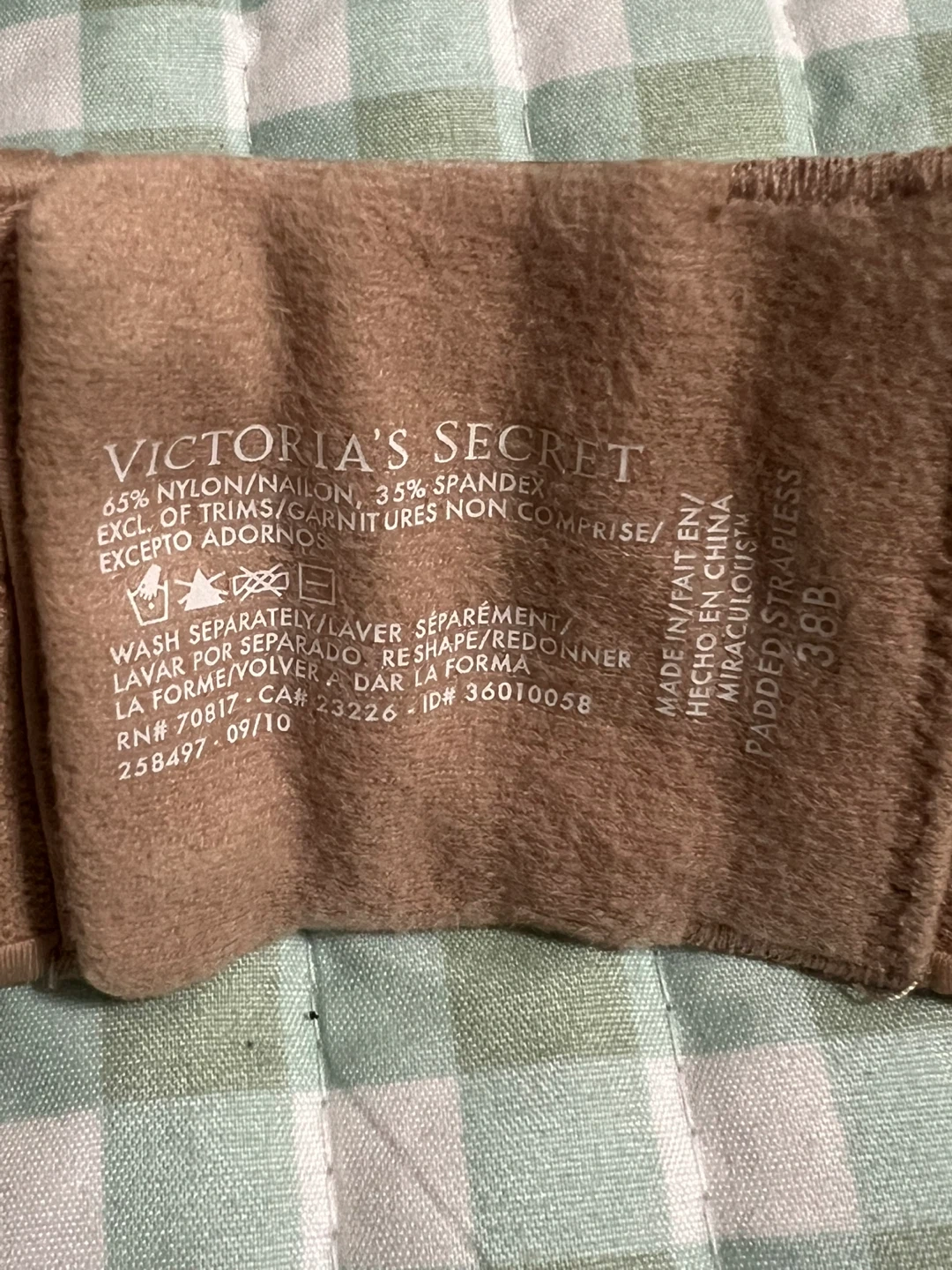Victoria's Secret Miraculous Padded Strapless Push-up Bra in size 38B. The bra is made of 65% nylon and 35% spandex. Includes removable straps.