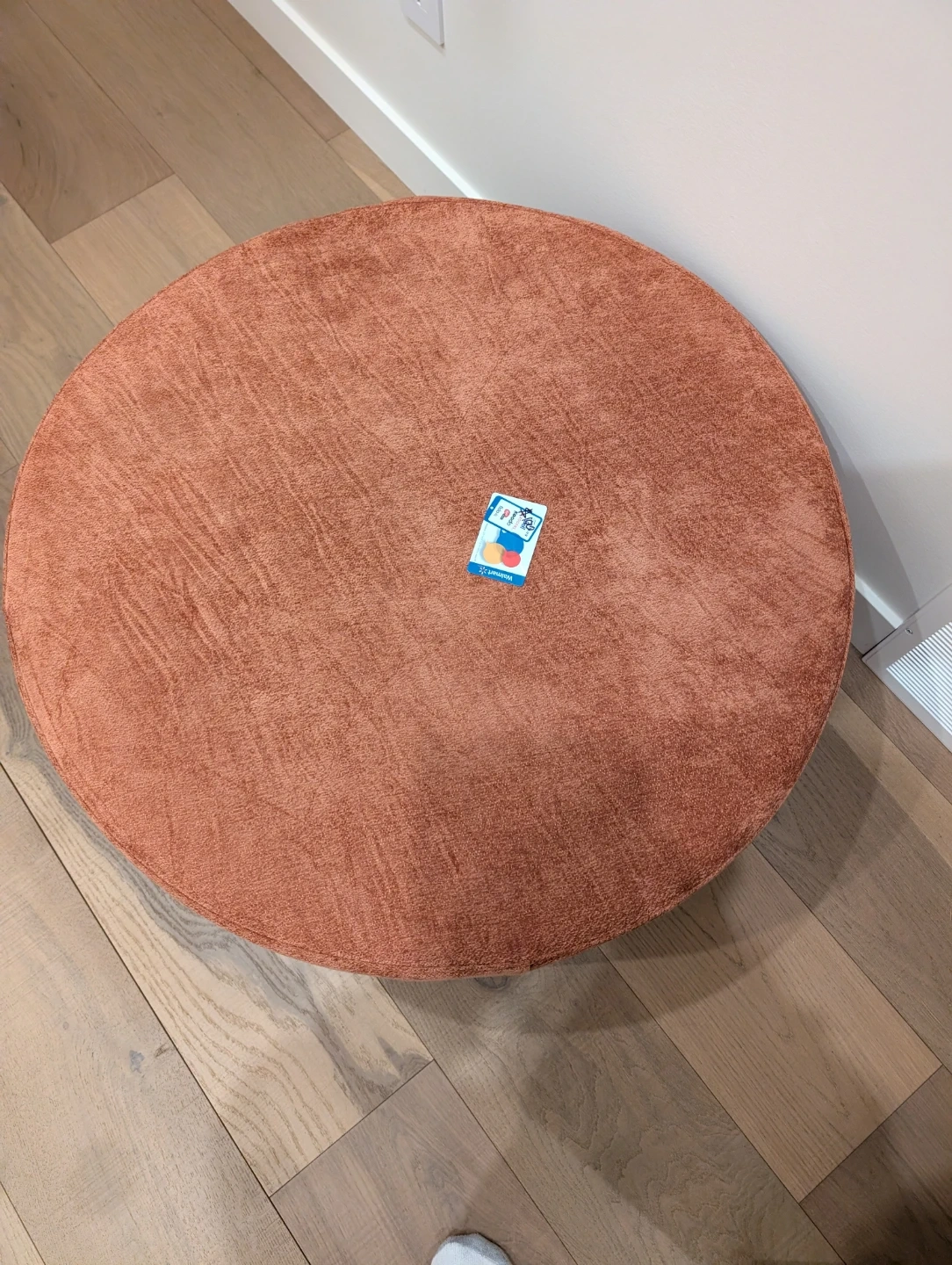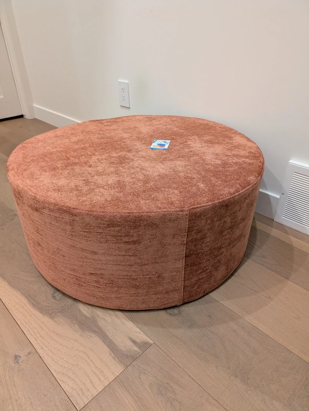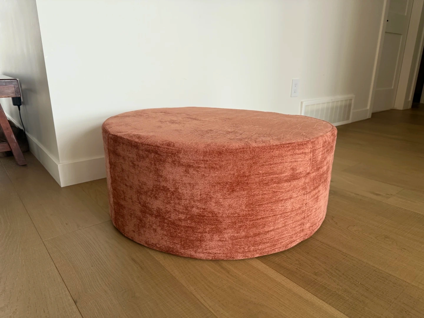 Selling a round velvet ottoman in a lovely coral colour. It's in great condition and would be a stylish addition to any living space! The material feels very soft and luxurious.