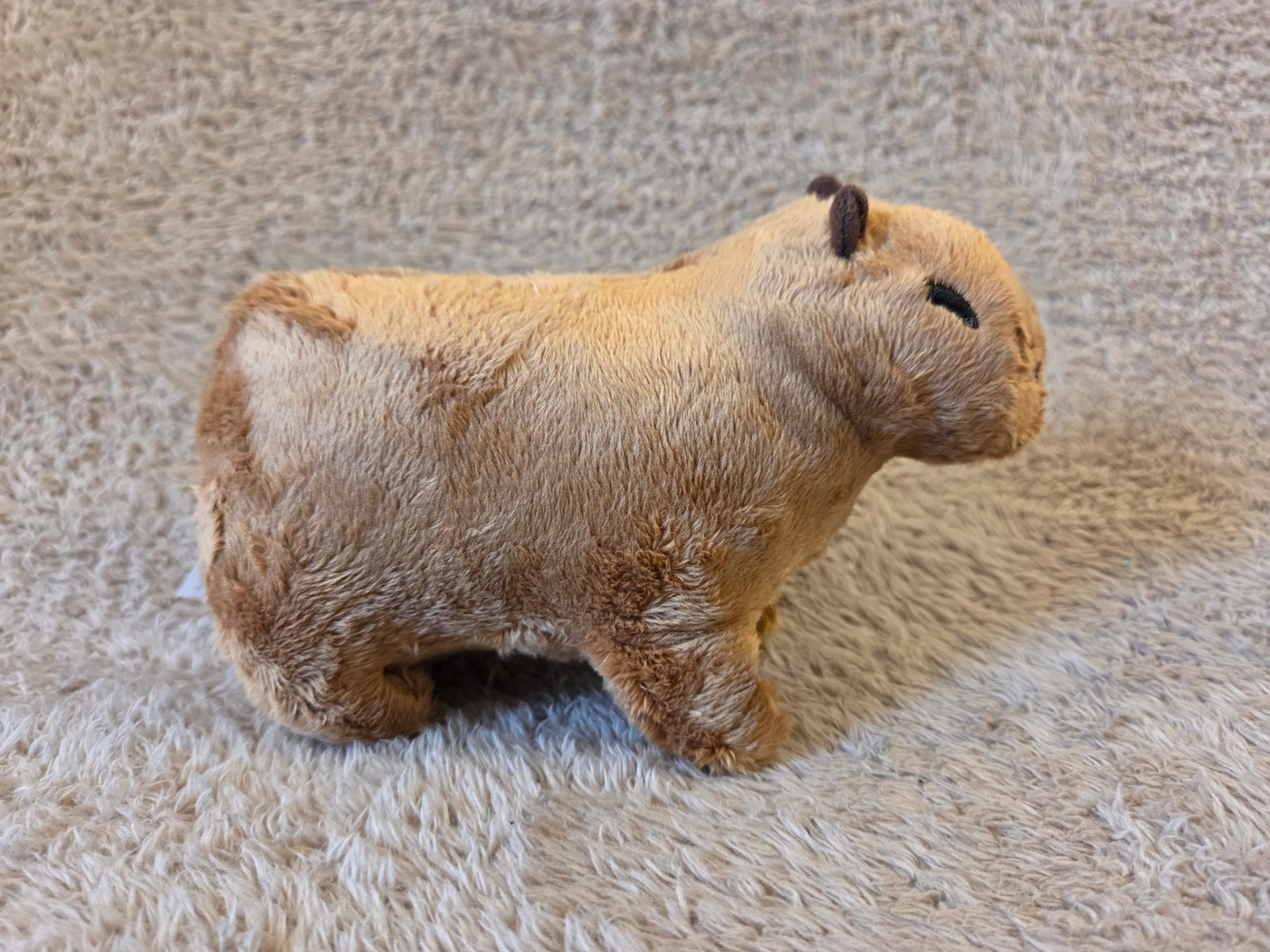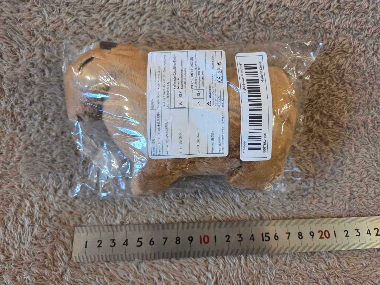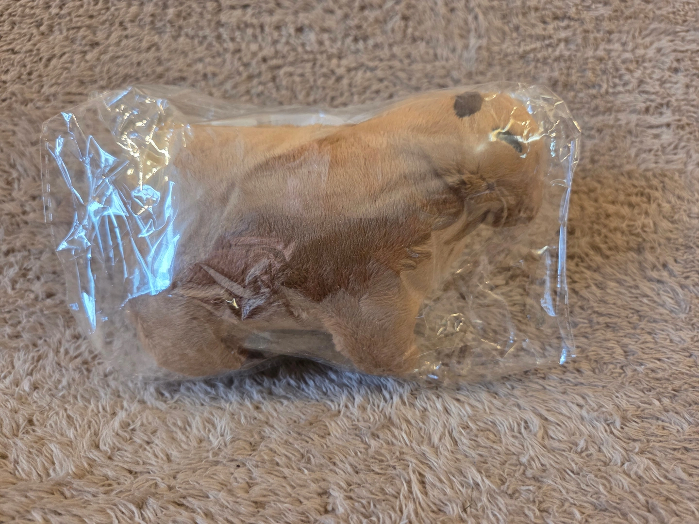 Cute capybara plush in light brown color – still sealed in the factory bag. Soft short-pile fabric, embroidered eyes, stands on four little legs. Size M. Approx. dimensions: 18 cm × 7.5 cm × 8.5 cm (7.1 in × 3.0 in × 3.3 in). Condition: brand new, never used, bag unopened. Great as a small gift, desk buddy, shelf decor or travel companion for kids and adults. Pickup at 24 Southport St, Toronto, M6S 4Z1.