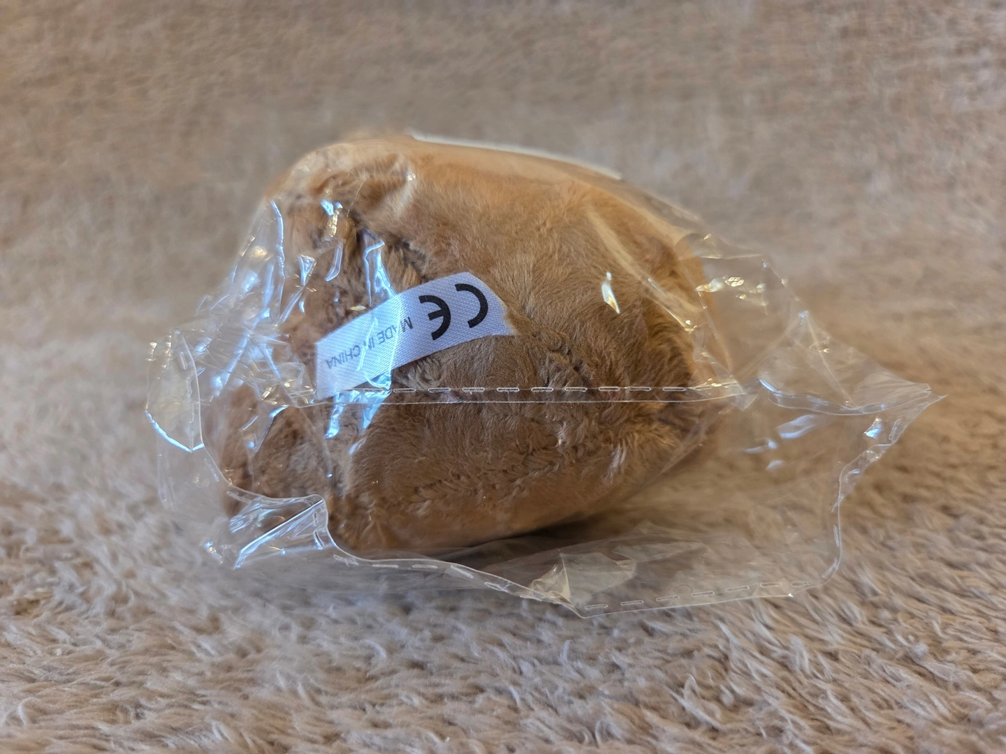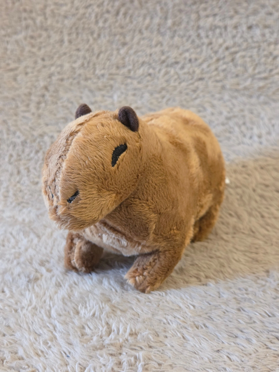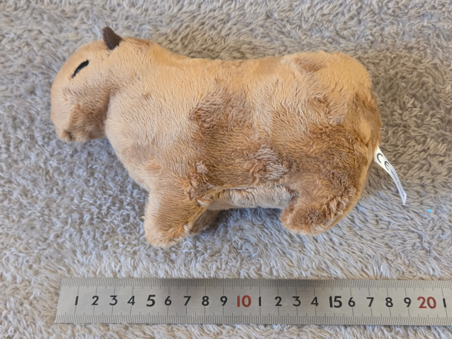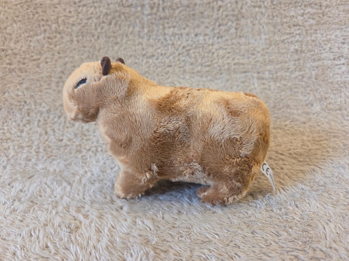 Cute capybara plush in light brown color – still sealed in the factory bag. Soft short-pile fabric, embroidered eyes, stands on four little legs. Size M. Approx. dimensions: 18 cm × 7.5 cm × 8.5 cm (7.1 in × 3.0 in × 3.3 in). Condition: brand new, never used, bag unopened. Great as a small gift, desk buddy, shelf decor or travel companion for kids and adults. Pickup at 24 Southport St, Toronto, M6S 4Z1.