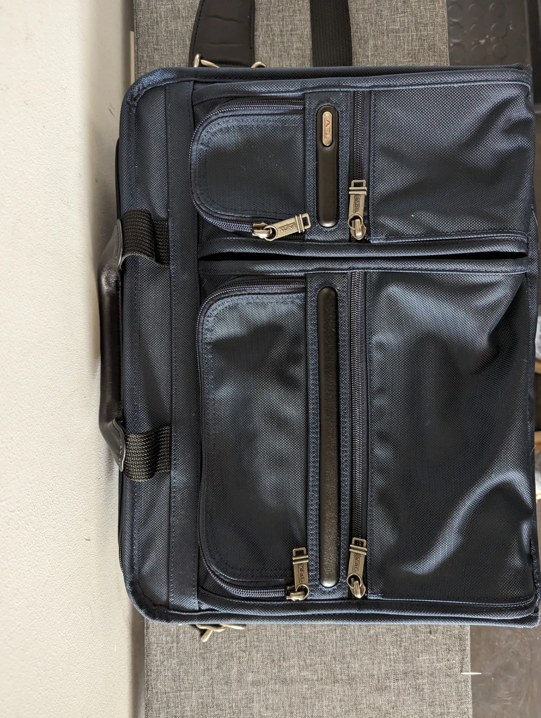 Selling a Tumi laptop bag in a nice blue colour. It has lots of compartments for organizing your things and a comfortable shoulder strap. Great for work or school!