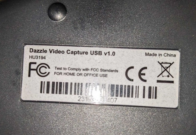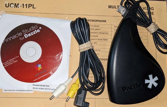 Dazzle HU3194 USB Video Capture Unit with Pinnacle Studio SW. Convert your VHS and analog videos to digital with this Dazzle HU3194 video capture device. Features & details: Converts analog video to digital for PC RCA (L/R/Video) + S-Video inputs for VCRs, camcorders, and DVD players USB-A connection to computer Supports real-time video capture Includes Pinnacle Studio for Dazzle software (original disc) Comes with 4-pin to RCA L/Video cable Model HU3194 v1.0 by Dazzle Ideal for preserving VHS tapes, home videos, and legacy footage before they degrade. Pickup Dufferin and Lappin