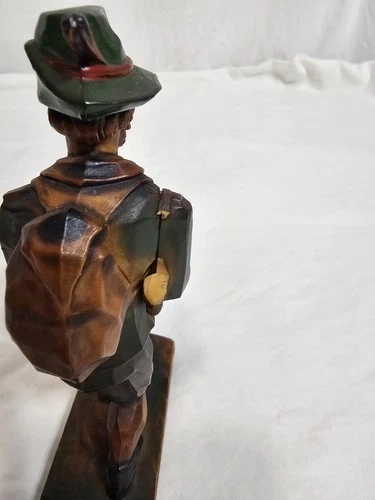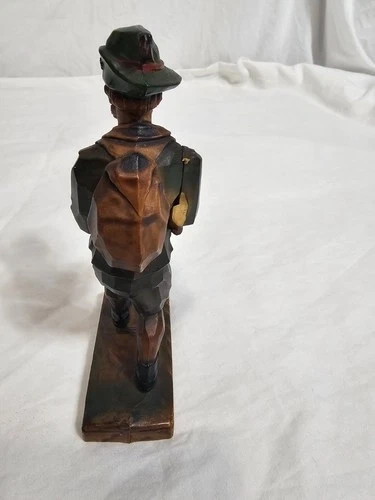 Wood-carved hunter figurine, crafted from quality wood. It features a multi-color palette that highlights the intricate details and artistry of bygone eras.