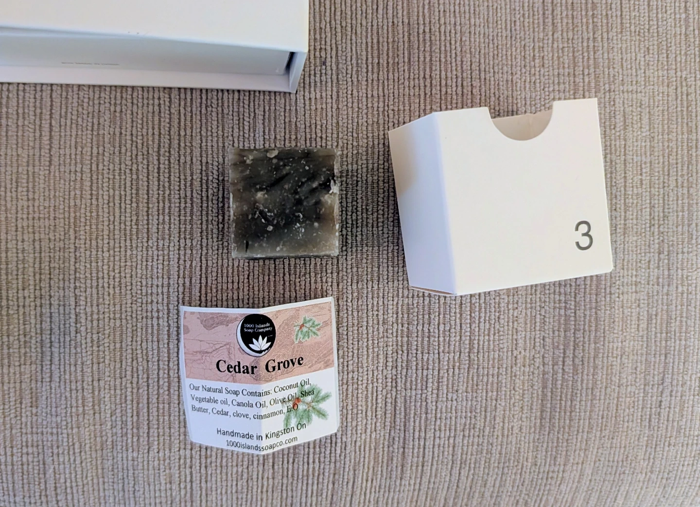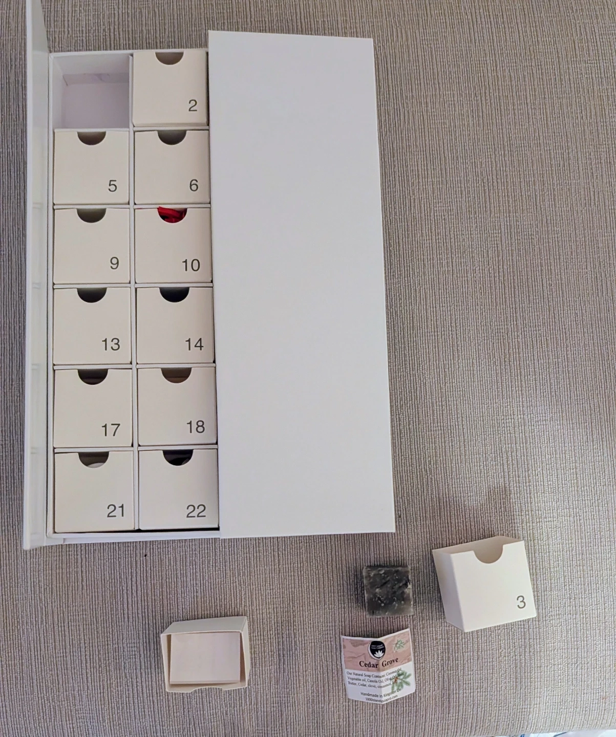 Selling a 1000 Islands Soap Co. advent calendar! It includes an assortment of natural soaps. The soaps contain coconut oil, vegetable oil, canola oil, olive oil, shea butter, cedar, clove, and cinnamon.