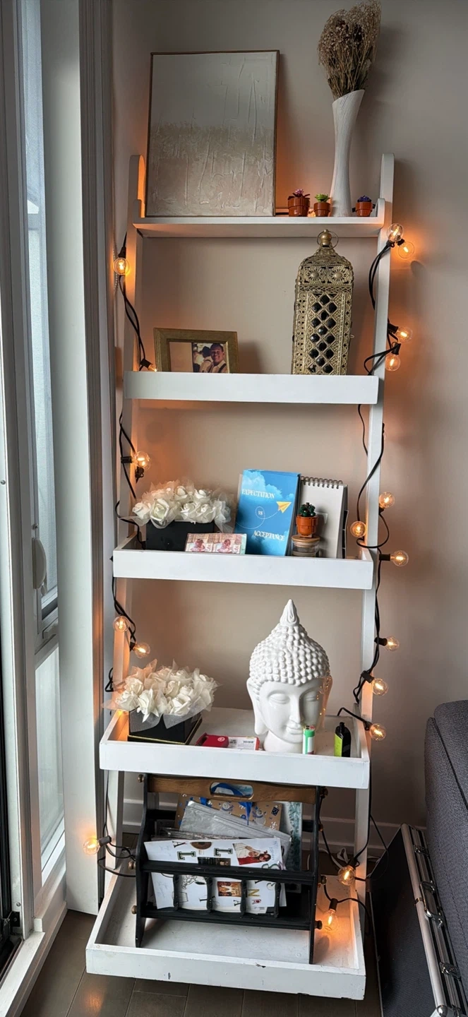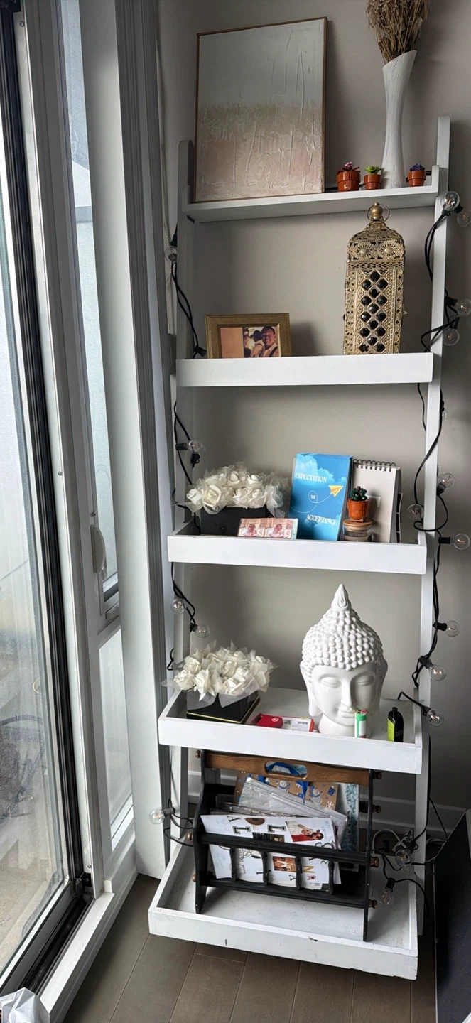 Selling a white ladder shelf. It's in great condition and perfect for adding some storage and style to any room. It has multiple shelves for displaying plants, books, or other decorative items. A great addition to any home!