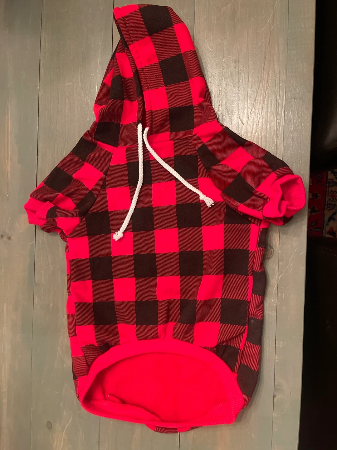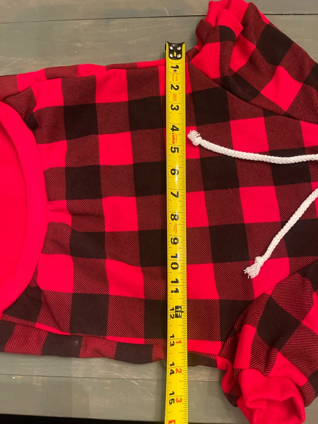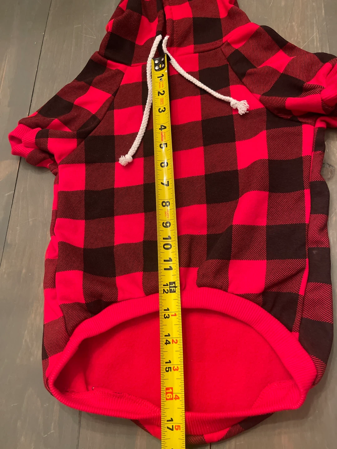 Selling a super cute red and black plaid dog hoodie! It looks to be about a size medium, measuring around 15 inches in length. Perfect for keeping your furry friend warm and stylish on chilly days! Label says large