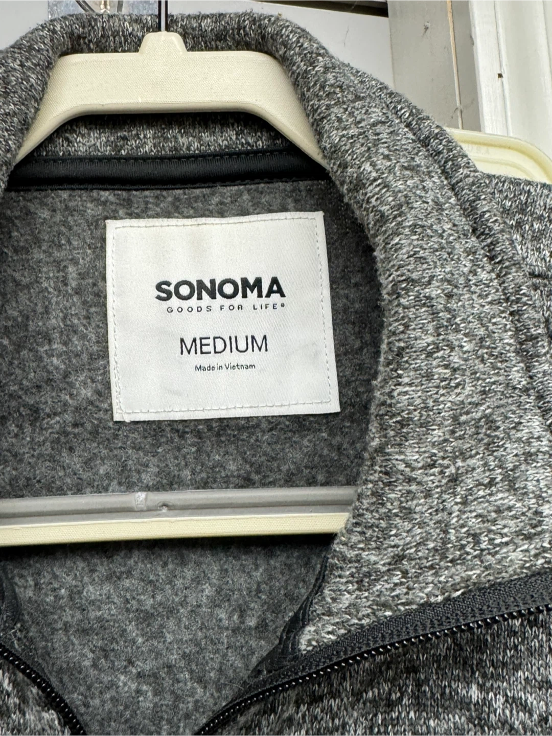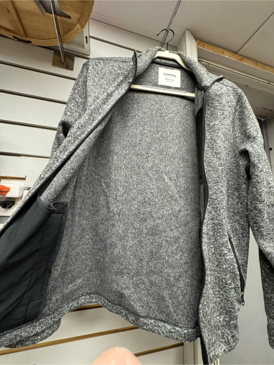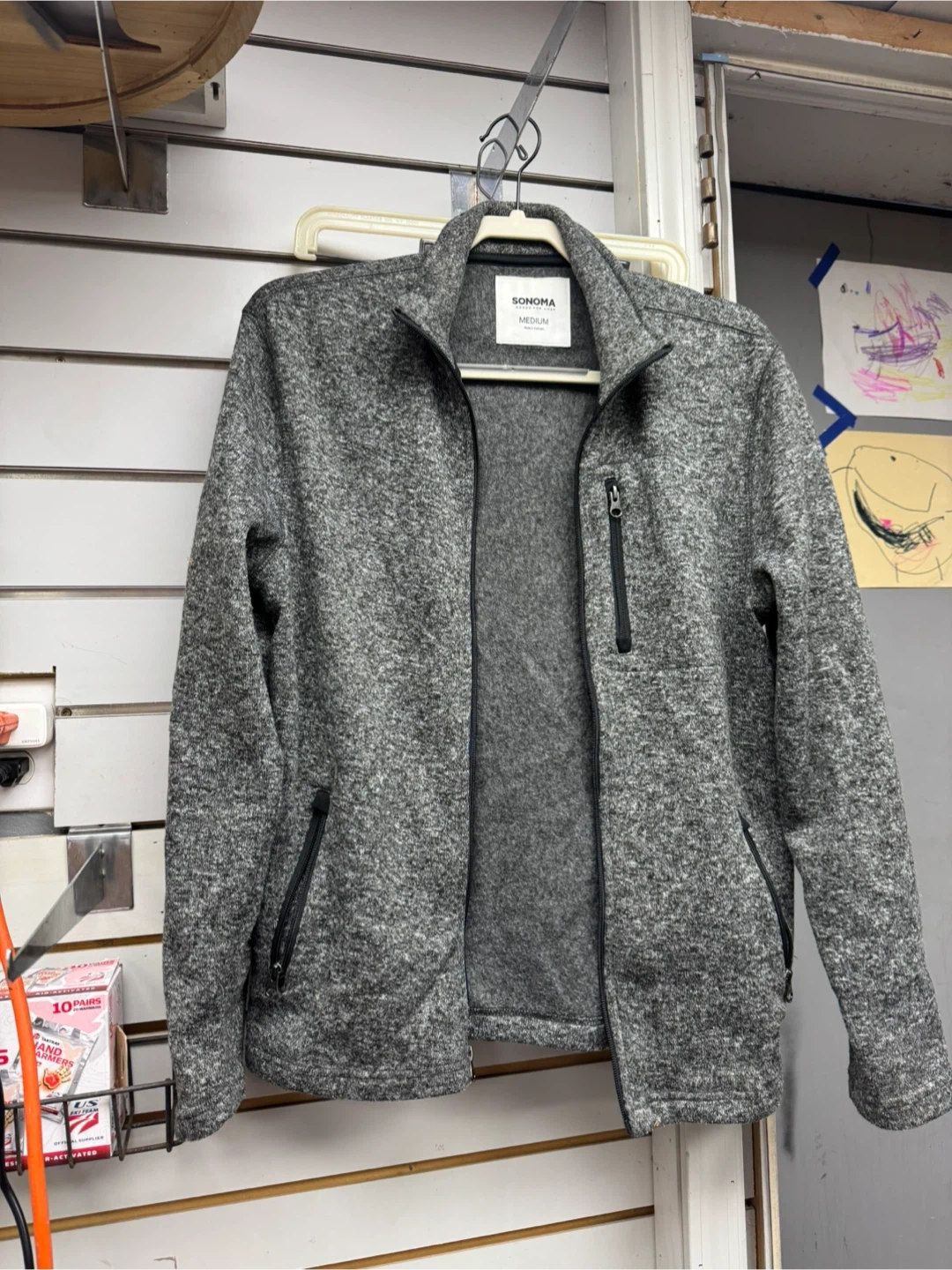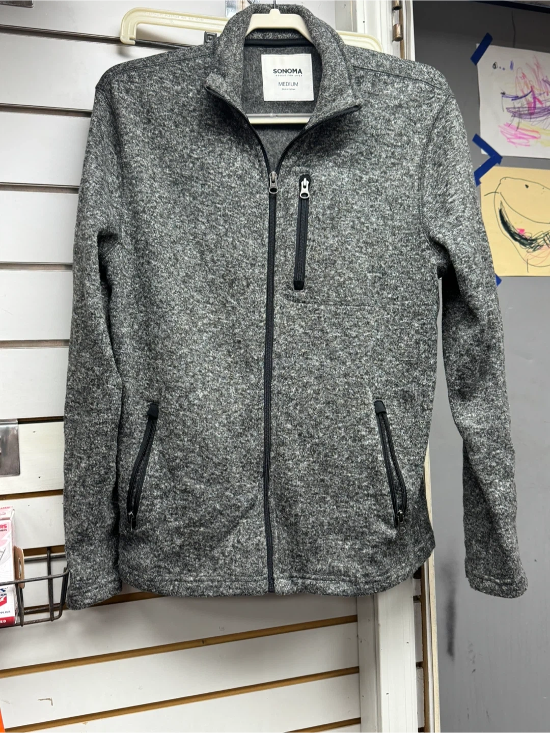 Selling a Sonoma jacket in size medium. It's a stylish gray color and in good condition. Perfect for layering or wearing on its own!