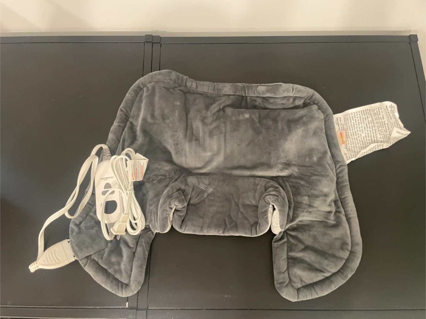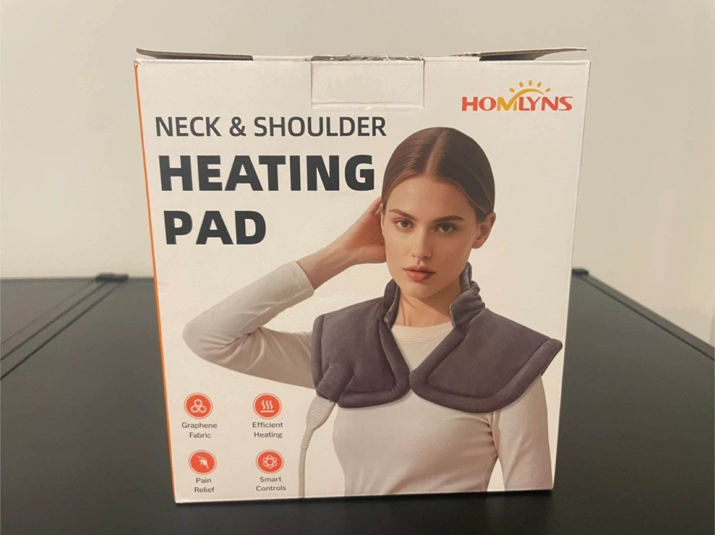 I'm selling a HOMELYNS neck and shoulder heating pad. Open box but never used. The heating pad features graphene fabric, efficient heating, and smart controls. It's designed for pain relief and provides targeted warmth to your neck and shoulders
