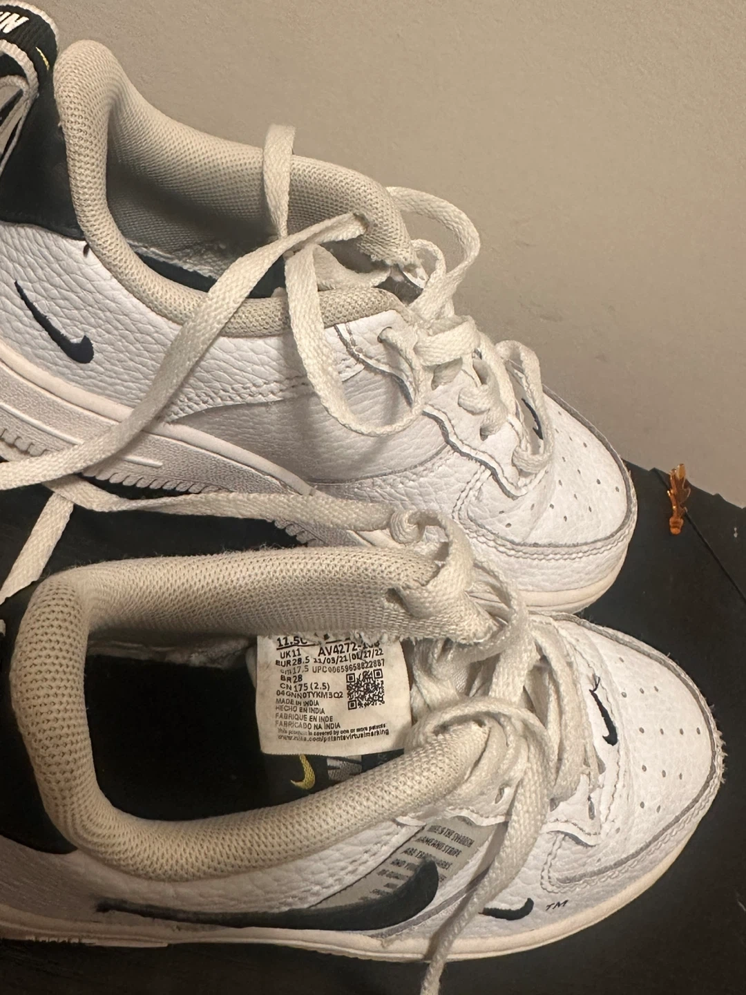 These are a pair of Nike Air Force 1 toddler shoes in size 11.5. They feature a white textured upper with a black Nike swoosh. The shoes are in good condition and ready for a new home!