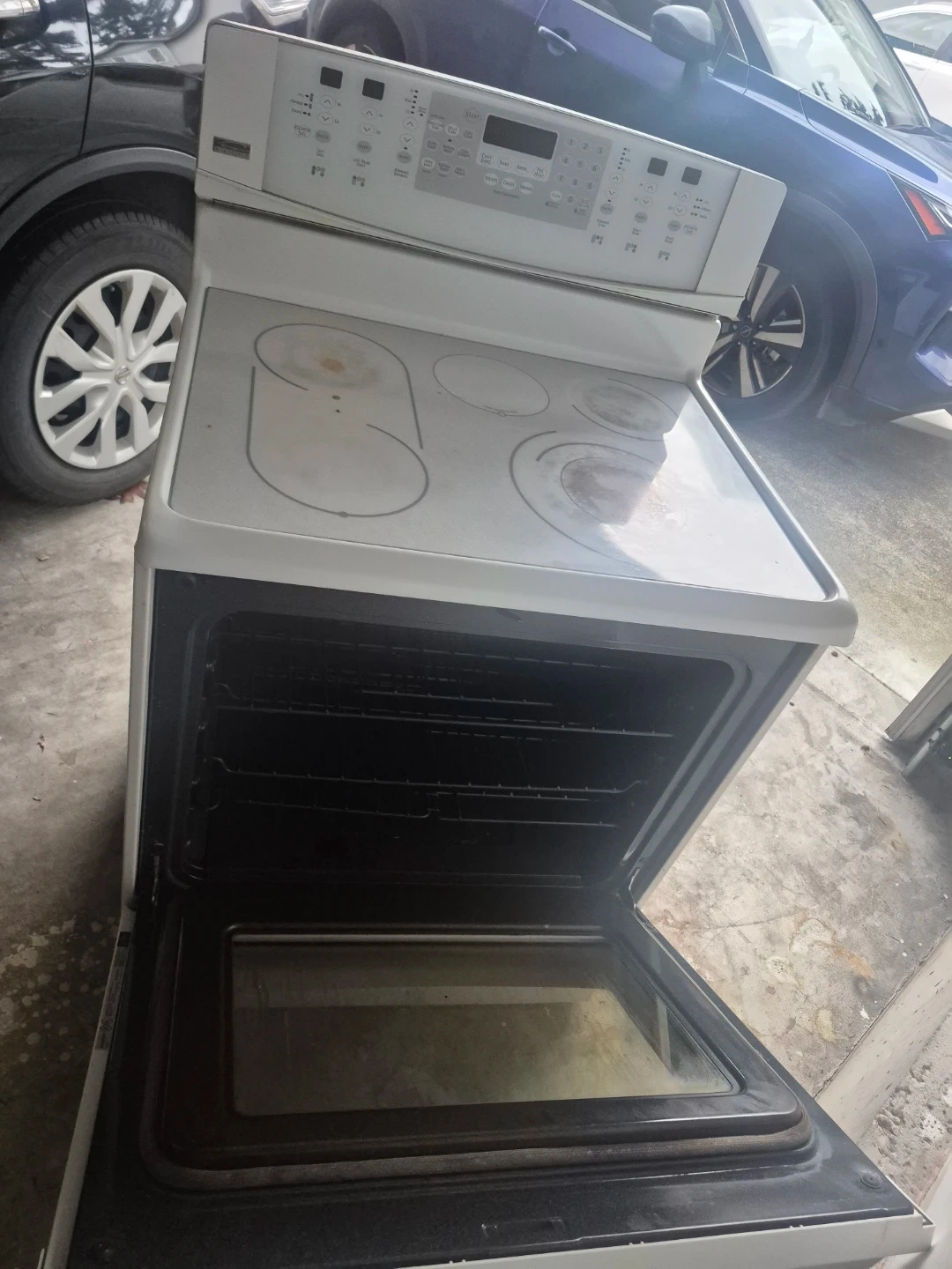 Kenmore electric range in white availablefor free. It's in used condition, with some signs of wear on the stovetop. Only 2 burners and oven are working.