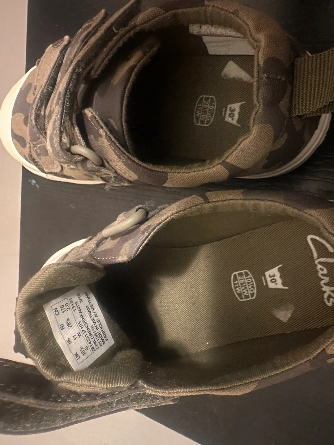 Selling a pair of Clarks kids' sneakers in a cool camo pattern! They're a size 11W (wide). These are in good condition and ready for a new adventure.