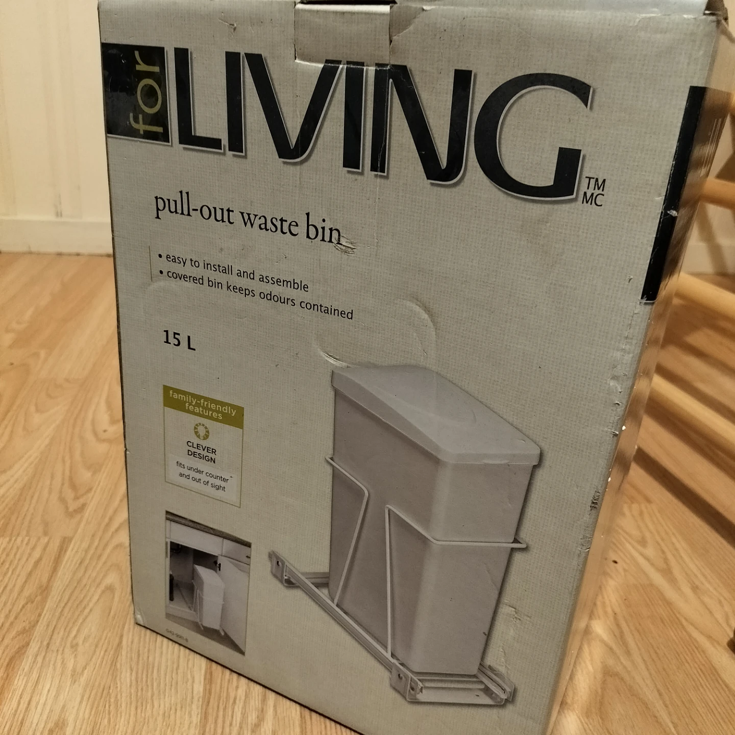Selling a for LIVING pull-out waste bin with a 15L capacity! It's easy to install and assemble, and the covered bin helps keep odours contained. It also has family-friendly features with a clever design that fits under the counter and out of sight.