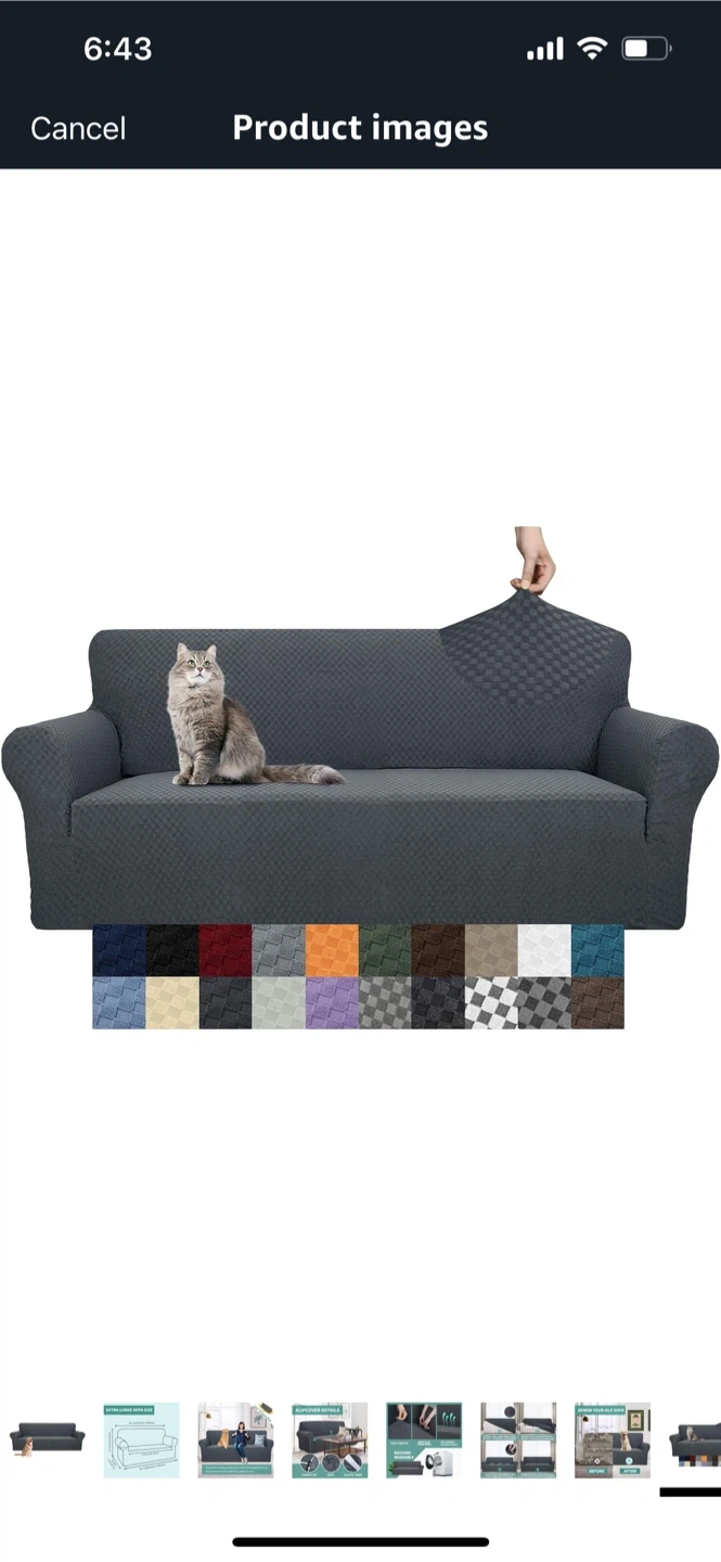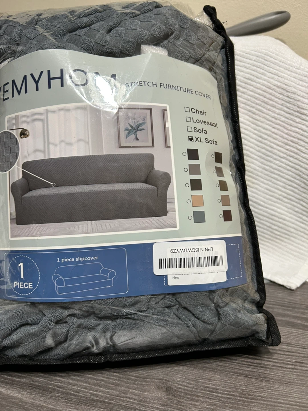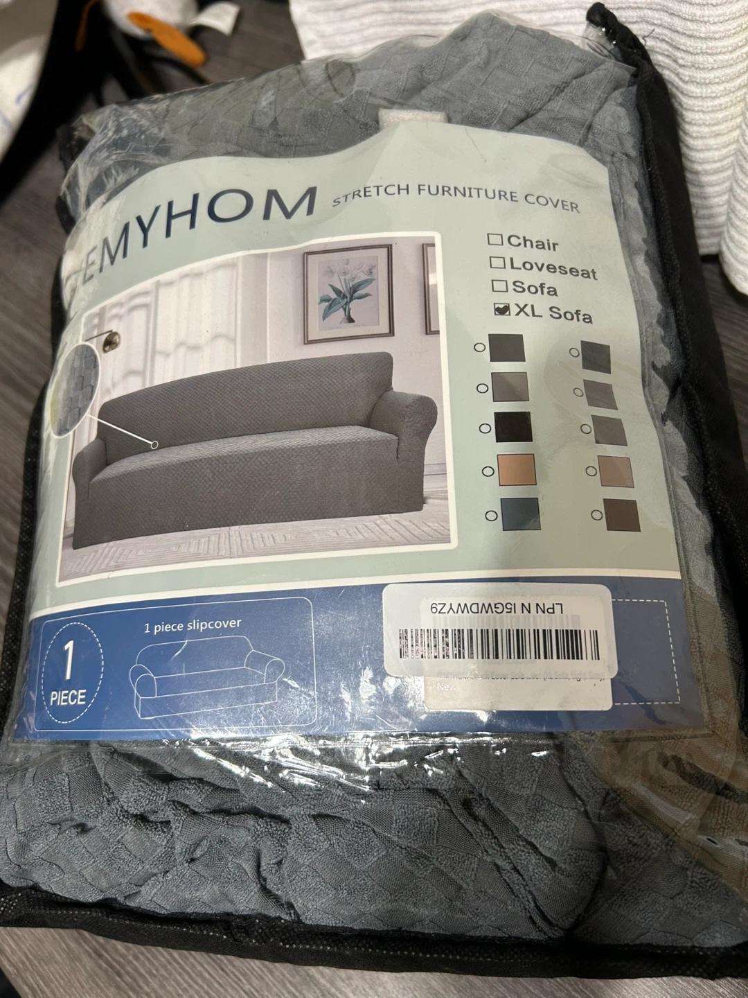 I have a YEMYHOM stretch furniture cover for an XL sofa available. It's grey and made of 85% polyester and 15% spandex. Fits XL sofas 92in to 115in wide (233cm to 292cm). Comes in the original packaging!