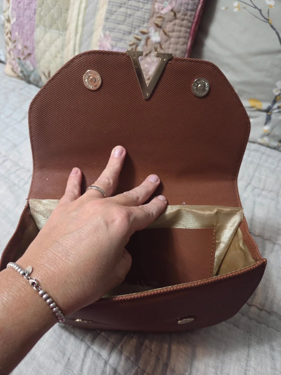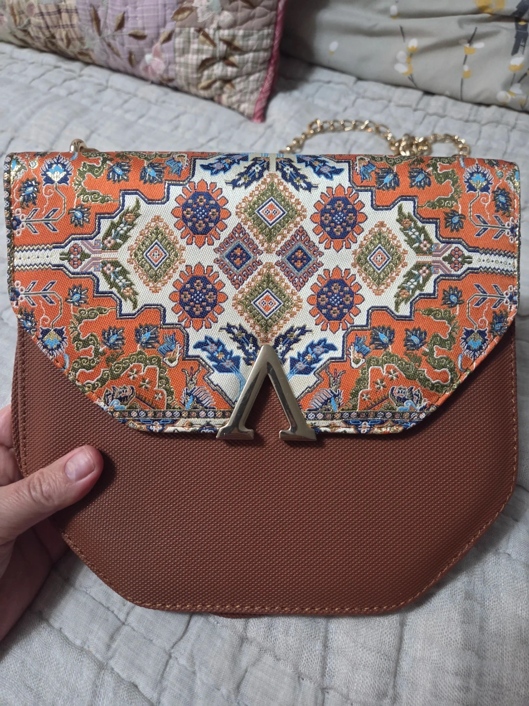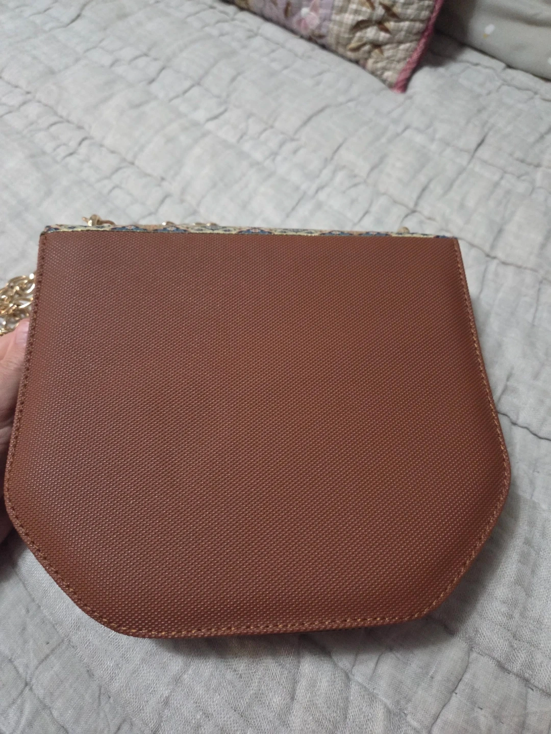 Here's a stylish brown shoulder bag with a unique patterned flap! It has a gold-tone chain strap and a distinctive 'V' detail on the front. The bag is in great shape and ready for a new owner