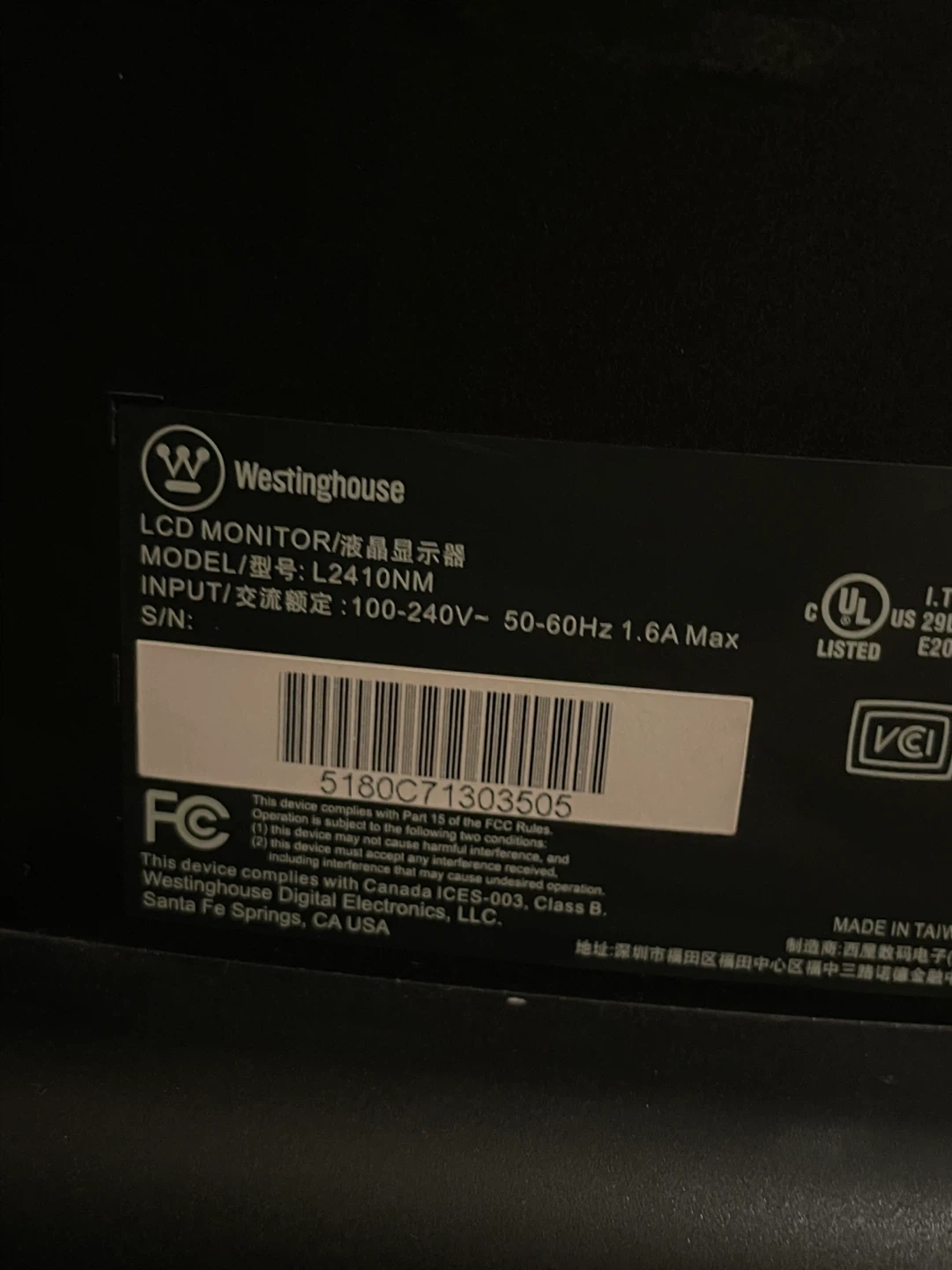 Selling a Westinghouse LCD Monitor, model L2410NM with Built In Speakers! It's in great shape and ready for a new setup.