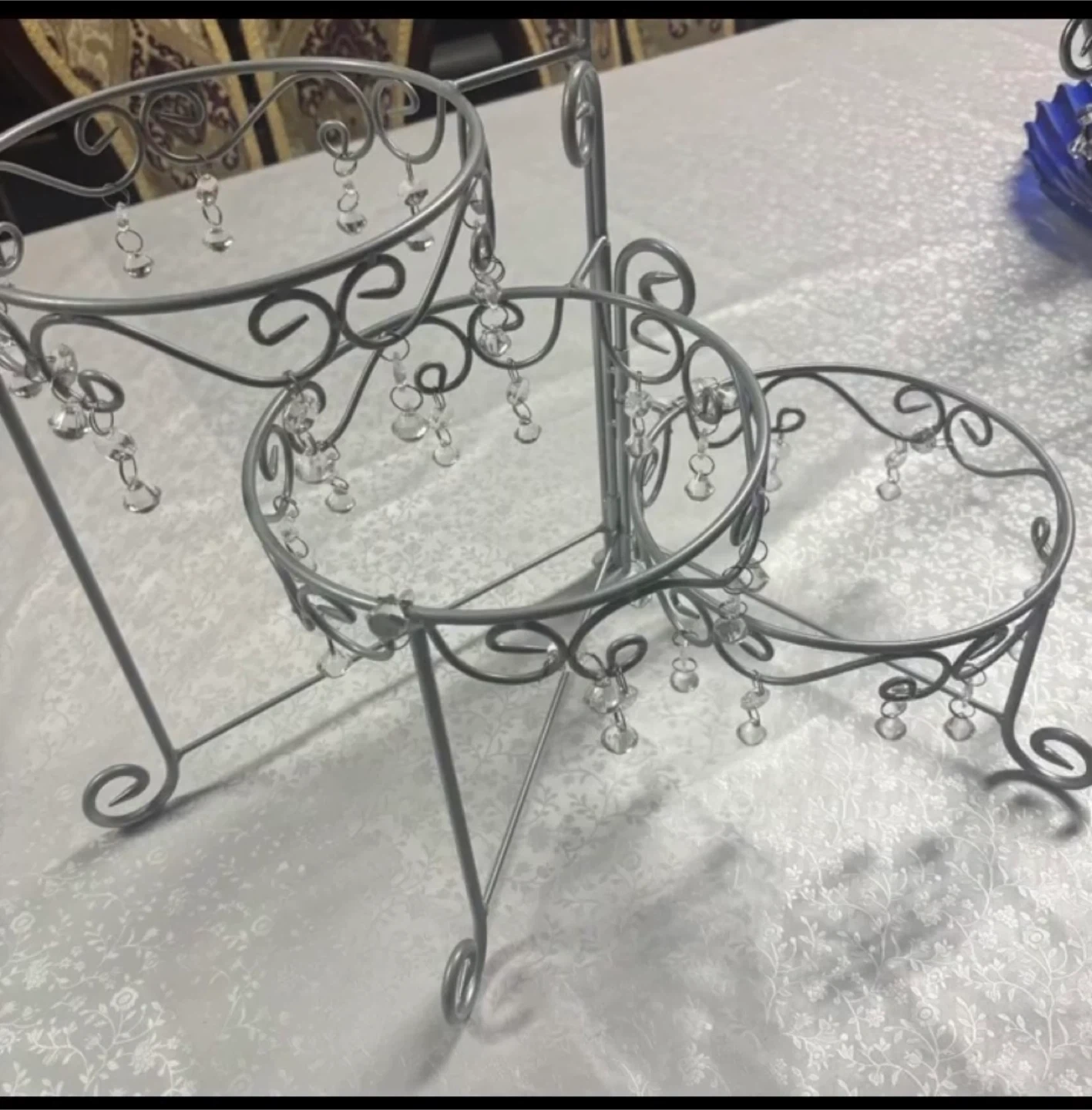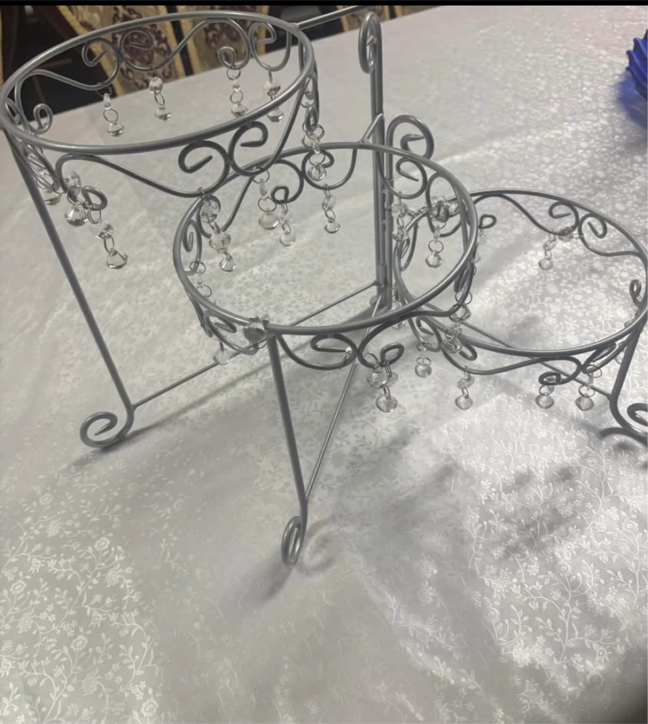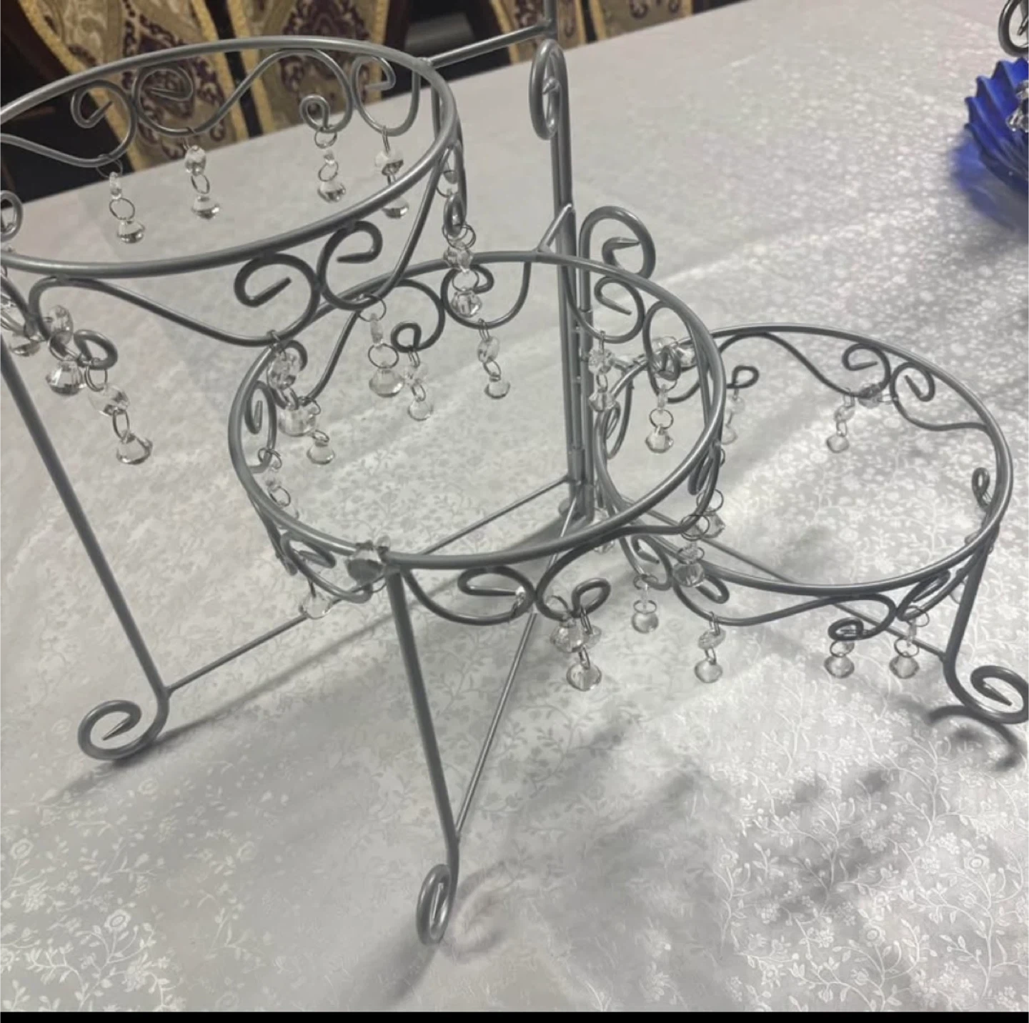 Selling a tiered cupcake stand. It's in great condition and features a silver finish with decorative crystal accents. Perfect for displaying cupcakes or other treats at parties or events!