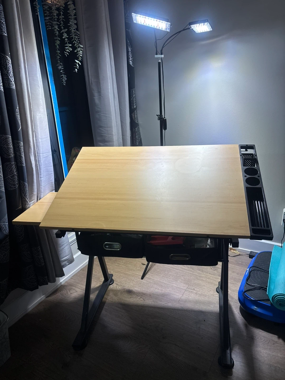 drafting table! It features a light wood-tone work surface and a black metal frame. There are storage compartments underneath the table top for supplies. Great for art projects or drafting!