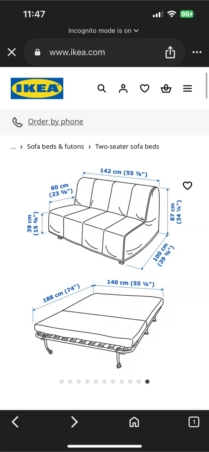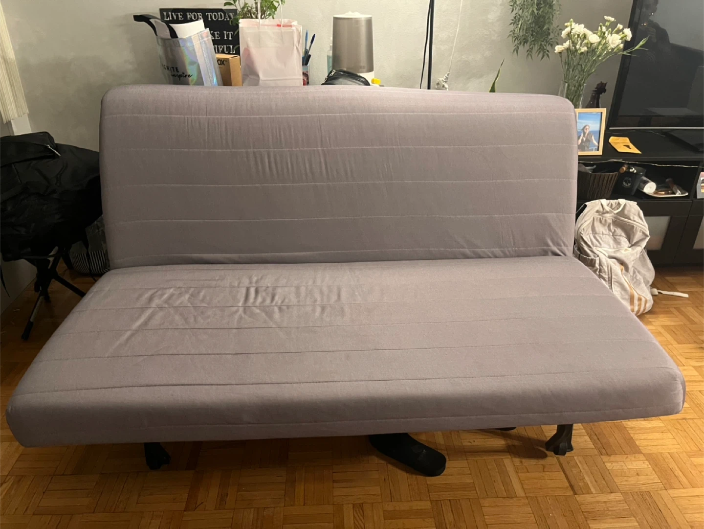Selling an IKEA LYCKSELE LÖVÅS sofa bed in Knisa light gray! The dimensions are 142 cm (55 7/8") wide, 87 cm (34 1/4") high, and 100 cm (39 3/8") deep. When folded out, it's 188 cm (74") long. The cover is made of 99% polyester. Originally bought for $479.00.