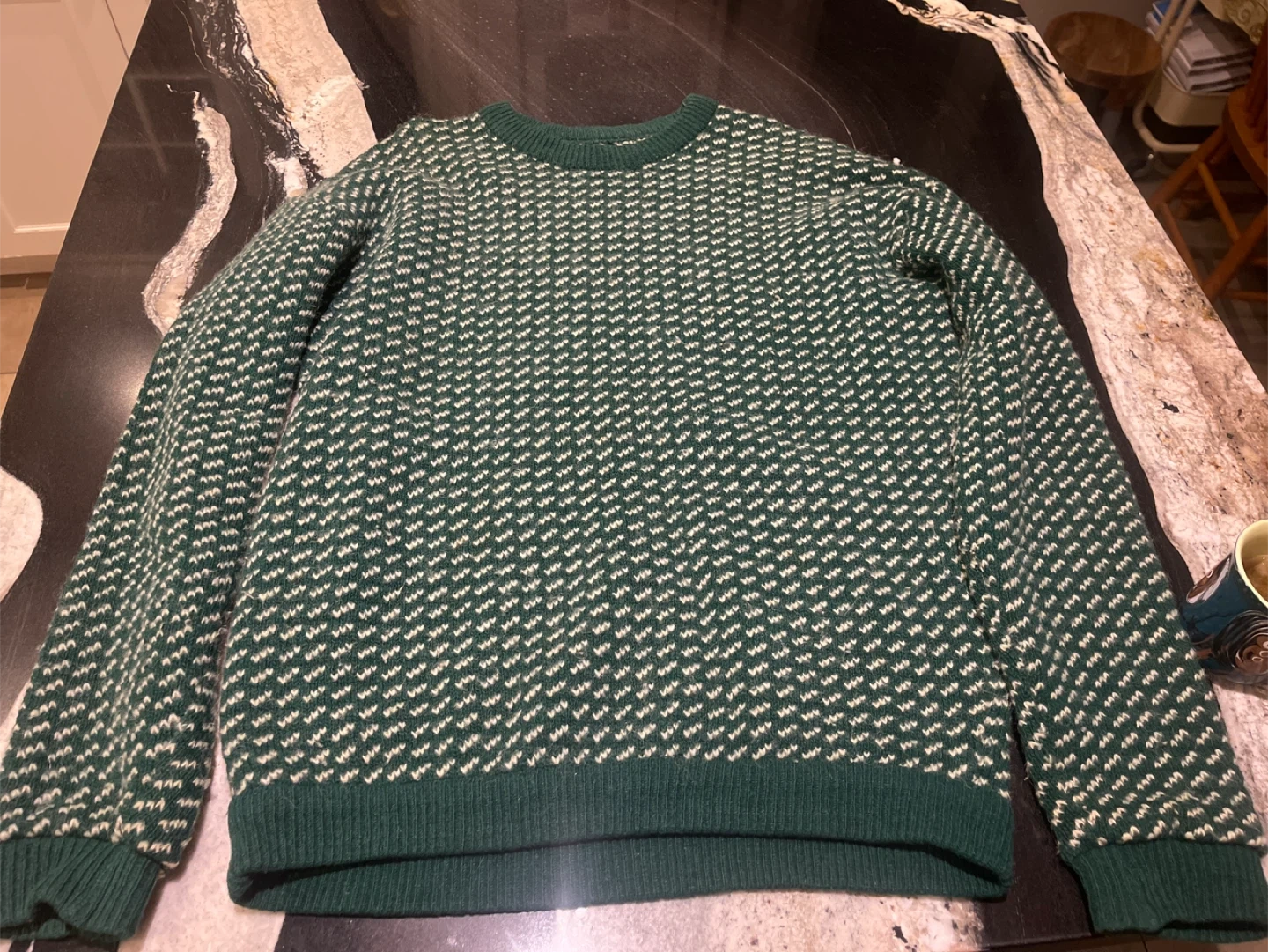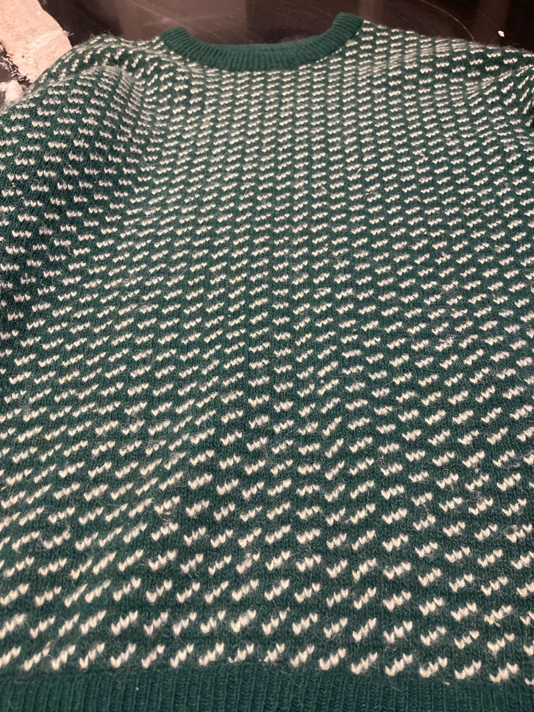Cozy Roots sweater in a lovely green and white pattern! The material is 75% wool and 25% nylon, so it's sure to keep you warm. Made in Norway