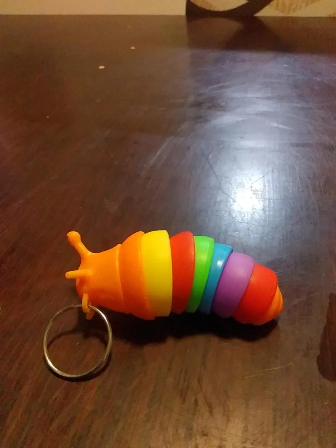 Here's a cute and colourful fidget slug toy! It's a fun little item to play with, featuring a rainbow of colours. It also comes with a key ring attached