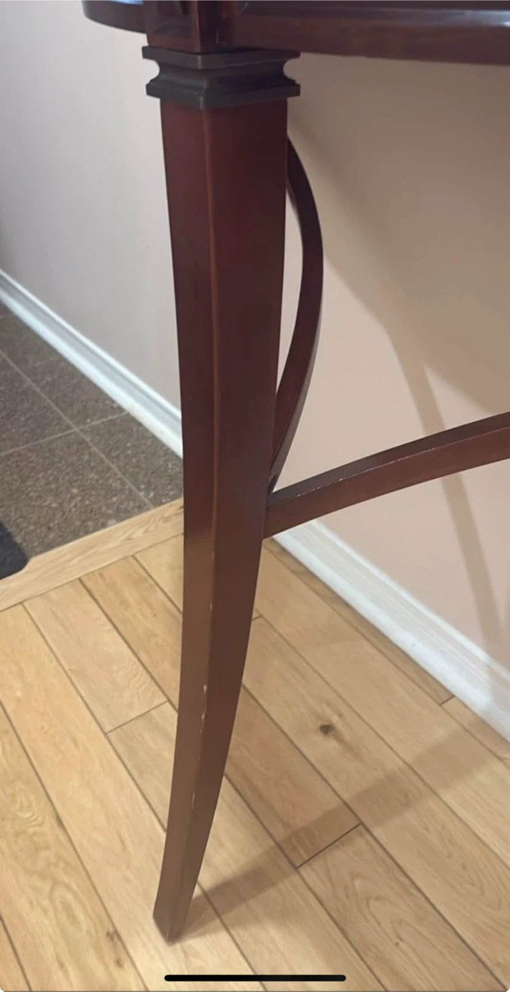 Selling a lovely wood hallway table with a matching mirror. It's in good condition and would look great in any entryway. The table has a unique half-moon shape and the mirror has a rectangular frame. Perfect for adding a touch of elegance to your home!