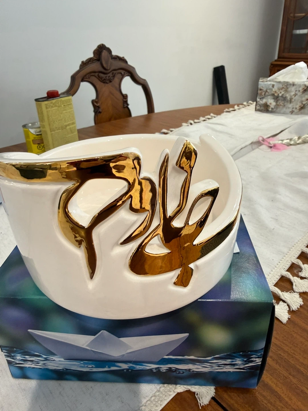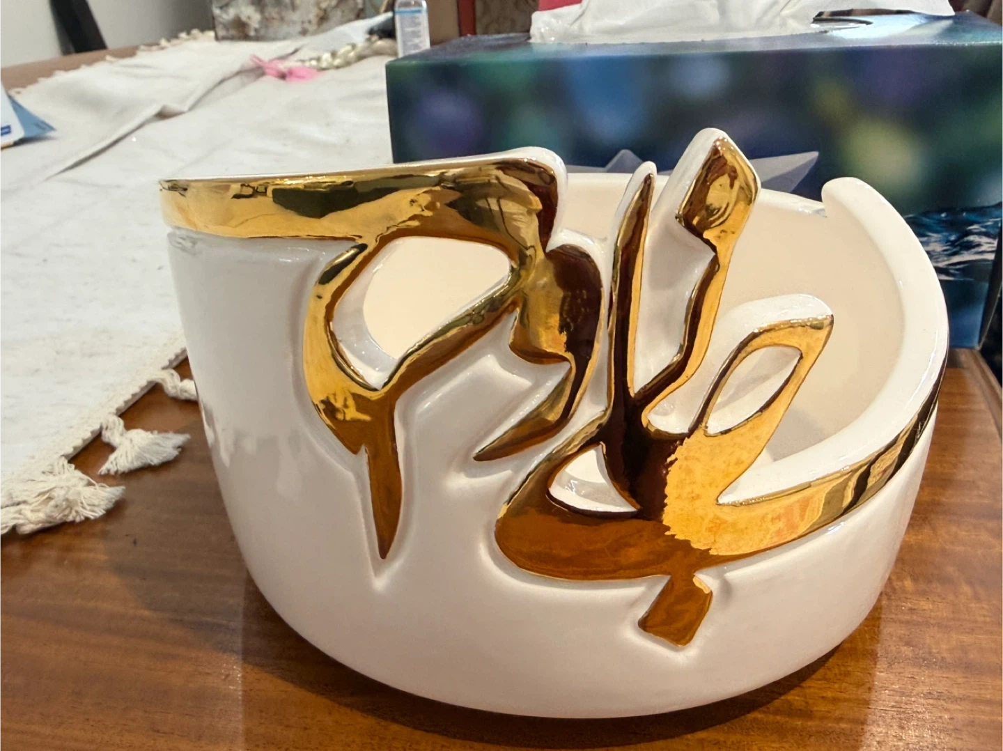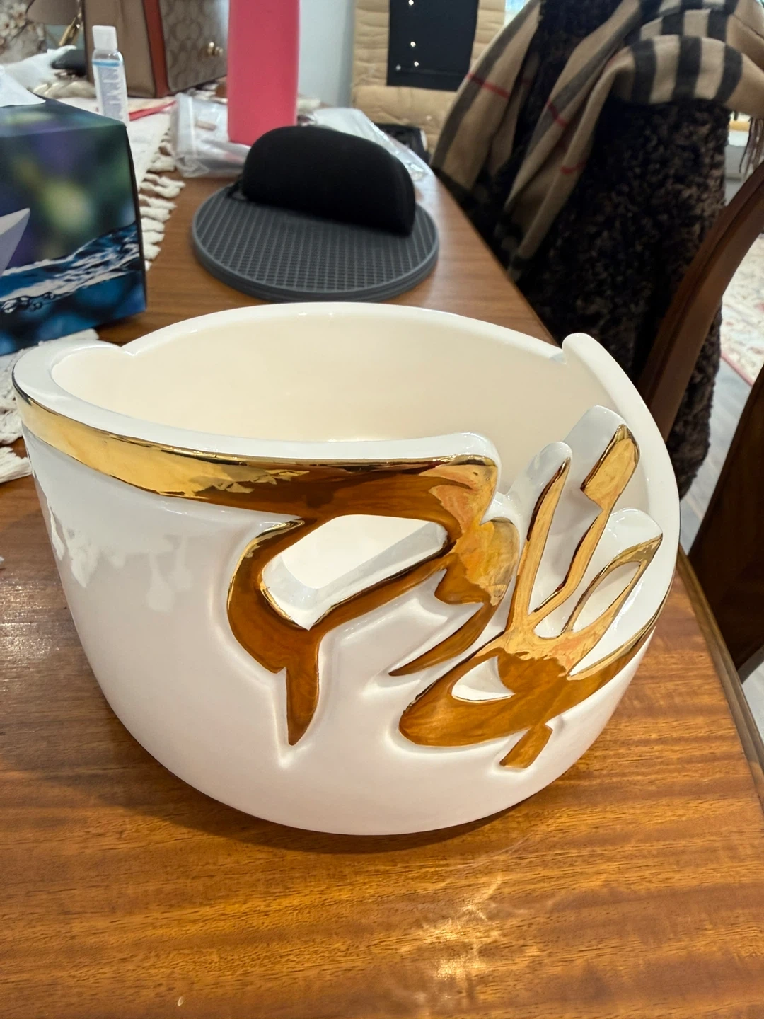 Selling a rare , one of a kind and lovely decorative Ceramic bowl . It's white with a unique gold accent design. The bowl measures approximately 8 inches in diameter, it is hand wash able and canbe used as decorative or nuts or fruit bowl. making it a nice size for a centerpiece or accent piece in your home.