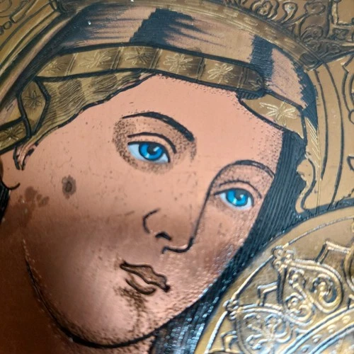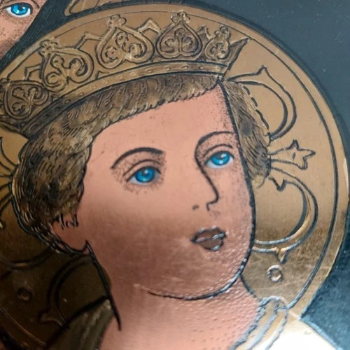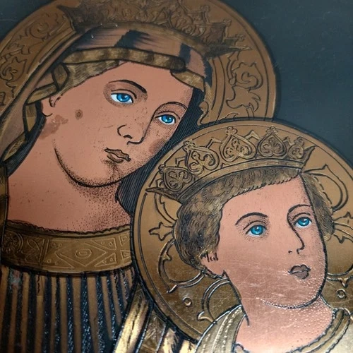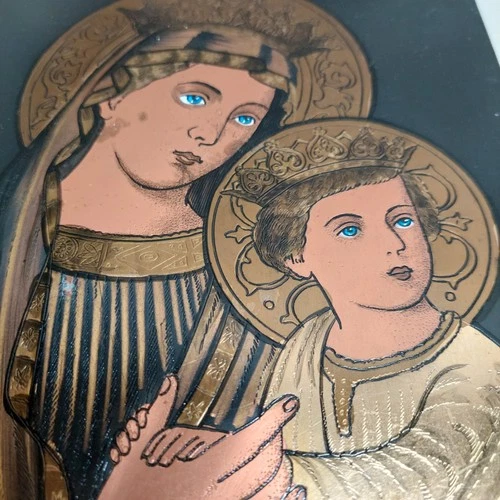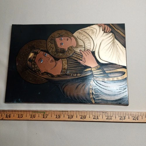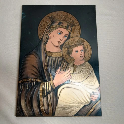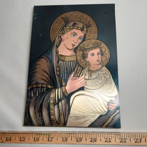 Beautiful mid-century devotional plaque depicting Virgin Mary and the Christ Child, rendered in a classic icon-inspired style with embossed gold detailing.