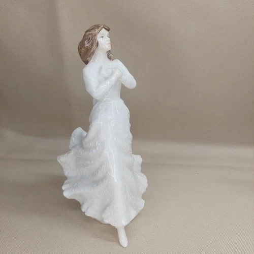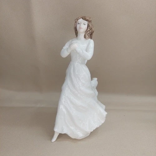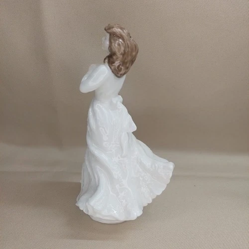 Beautiful and elegant Royal Doulton “Forget-Me-Not” bone china figurine, hand made and hand decorated in England. This graceful young woman in a flowing white gown is captured in a soft, romantic pose, reflecting Royal Doulton’s classic figurative style and fine craftsmanship.