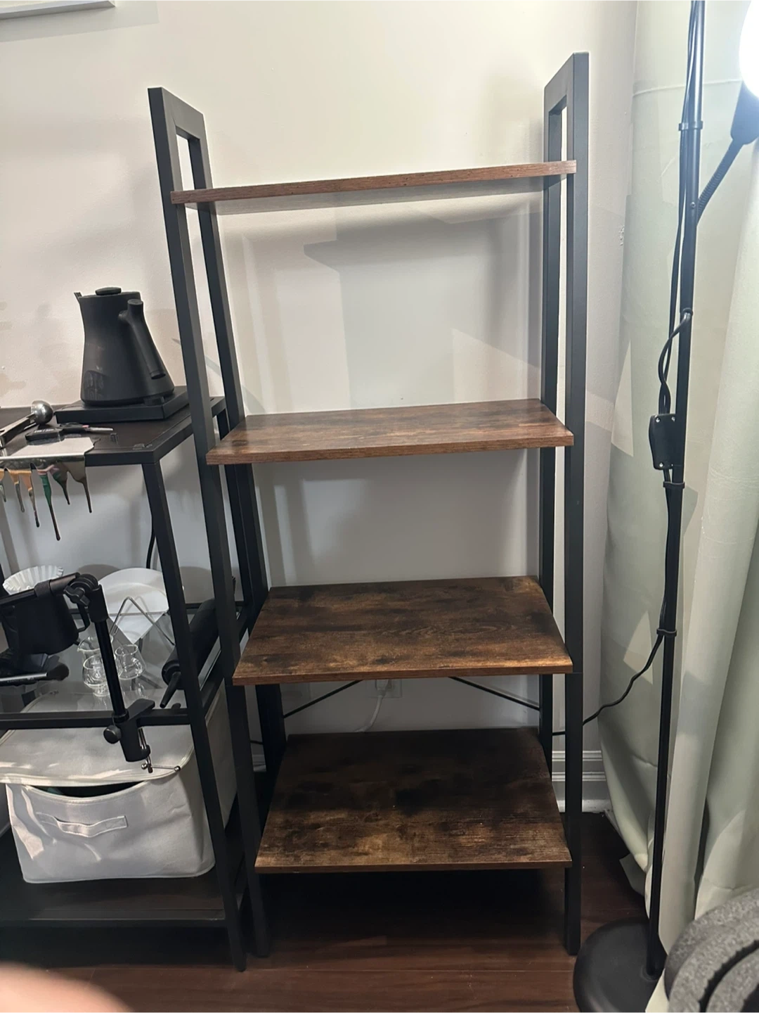 Selling a 4-tier ladder shelf with a rustic brown finish and black metal frame. It's perfect for adding storage and style to any room! The shelves are great for books, plants, or decor