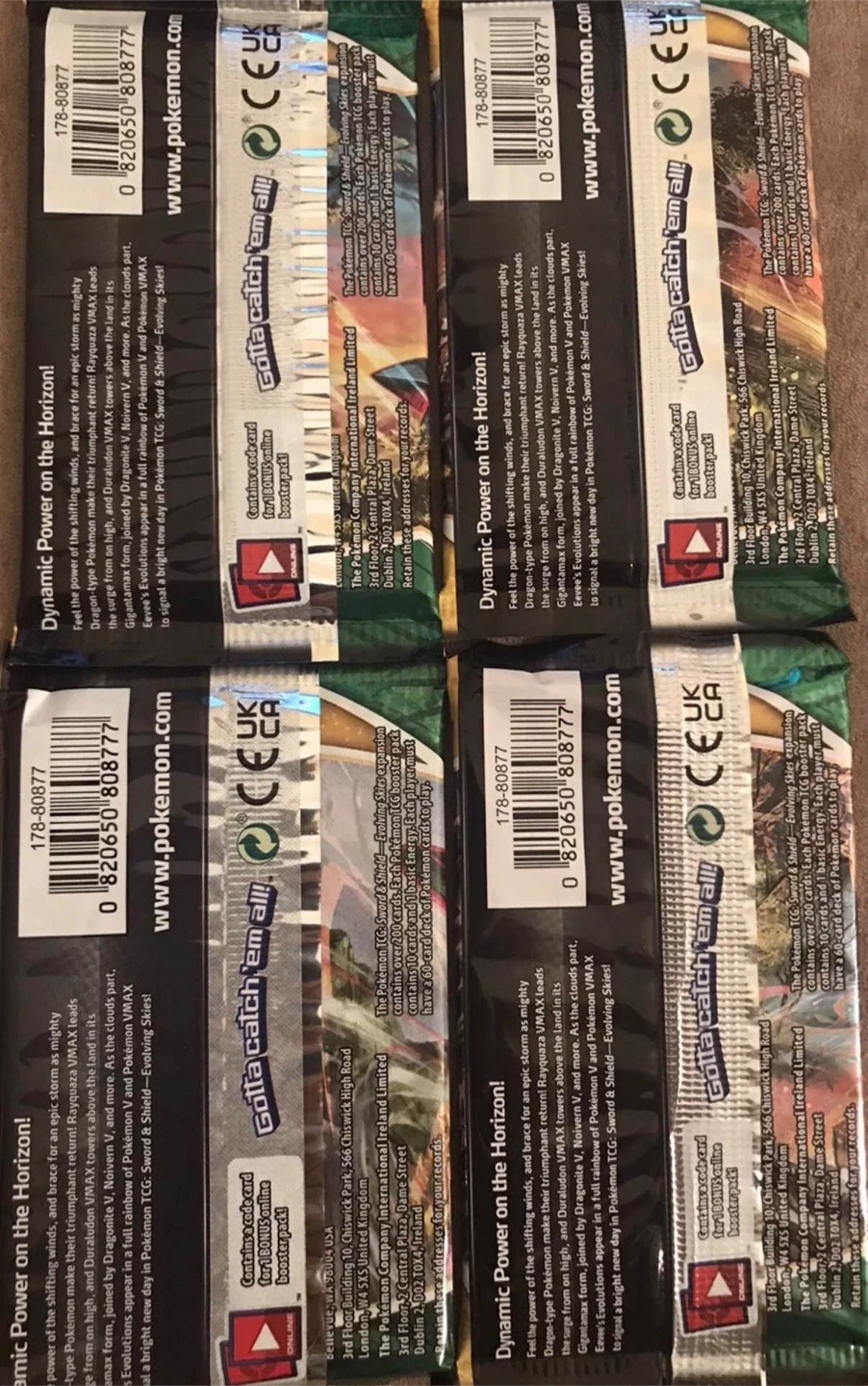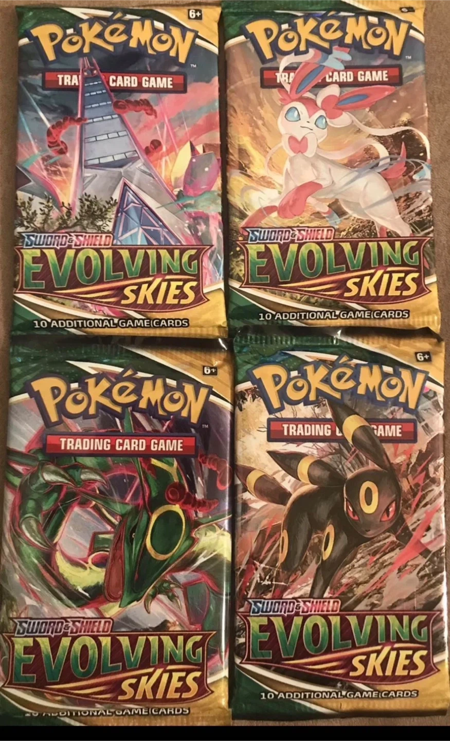 Selling four Pokemon Trading Card Game Sword & Shield Evolving Skies booster packs. Each pack contains 10 additional game cards. Perfect for expanding your collection or getting into the game!