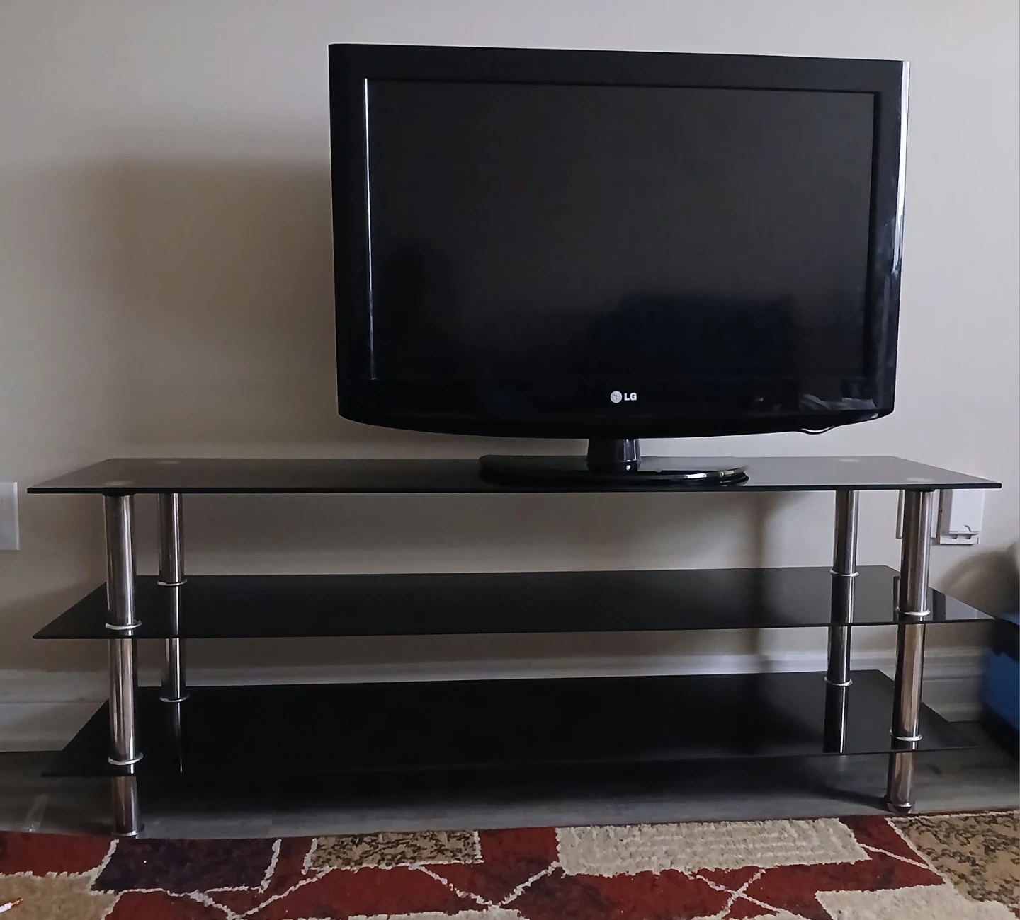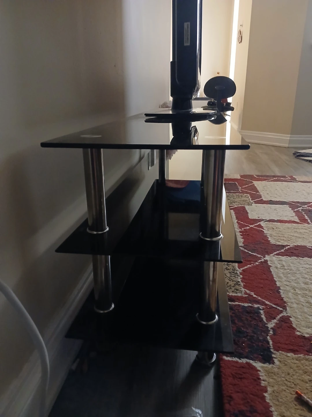 Selling a black glass TV stand in good condition! It has three shelves, perfect for storing your media devices and accessories. The stand features a sleek design with chrome-finished legs, adding a modern touch to your living room. It's sturdy and provides ample space for your TV and other entertainment essentials.