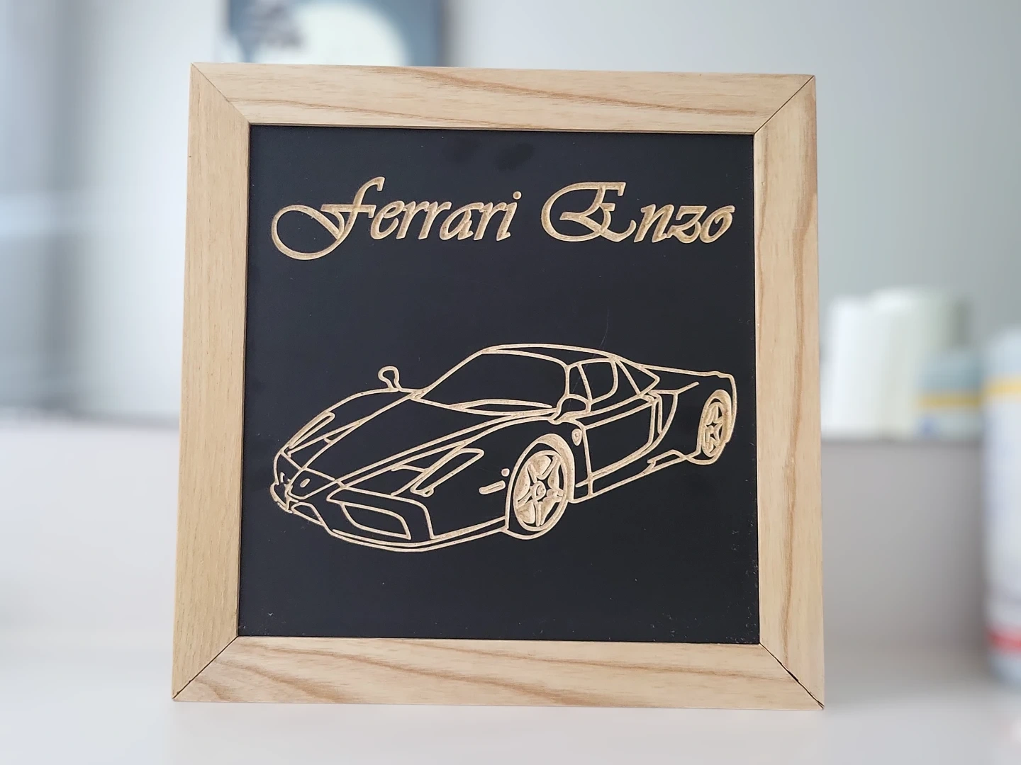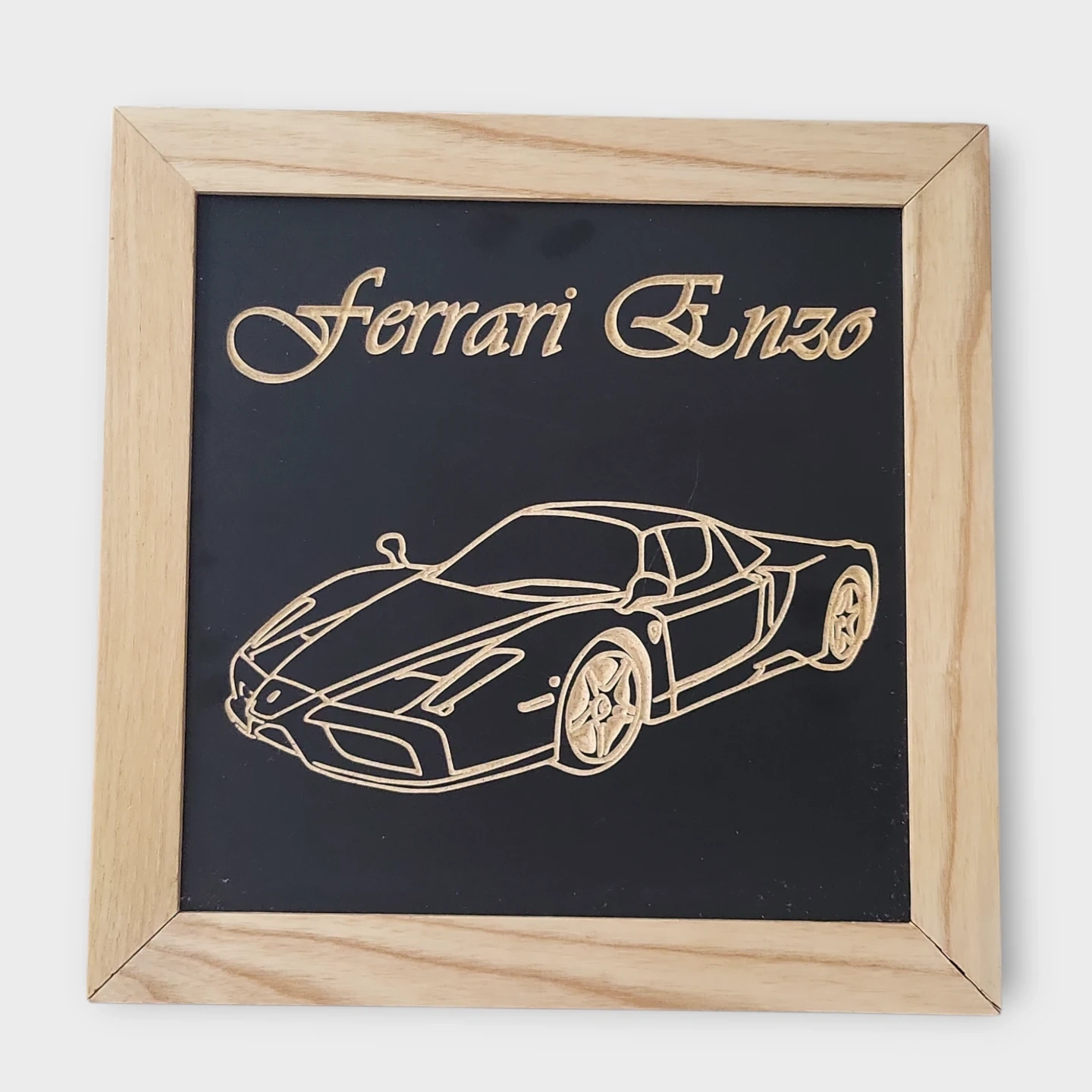 Here's a lovely piece of wall art featuring a Ferrari Enzo design. It's a wooden framed piece that would look great in any car enthusiast's space!