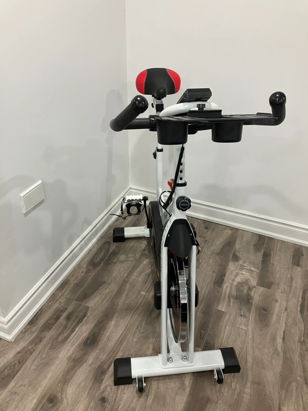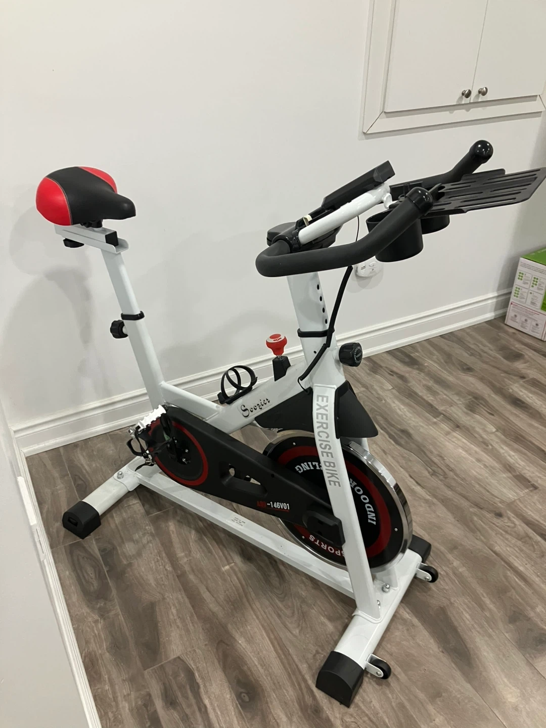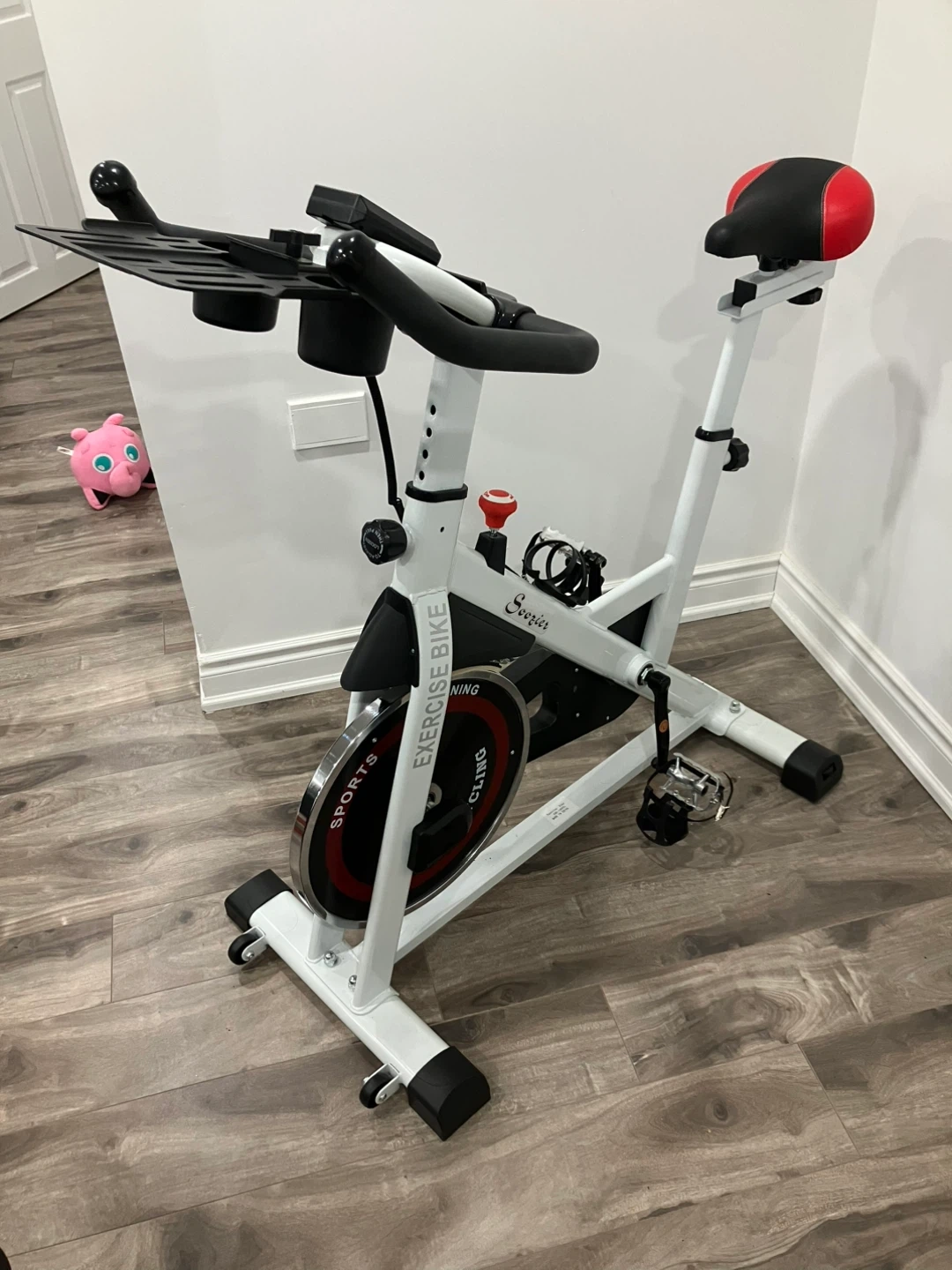 Get your sweat on with this Serenelife indoor exercise bike! It's white with red and black accents, and in great condition. Perfect for getting a workout in at home!