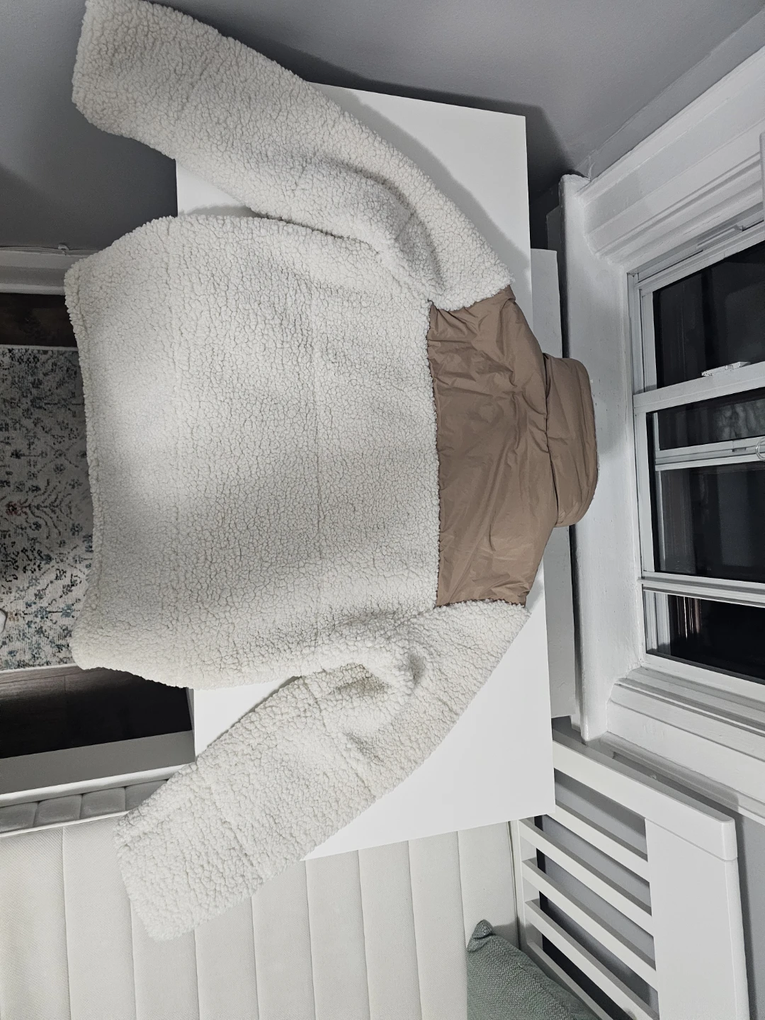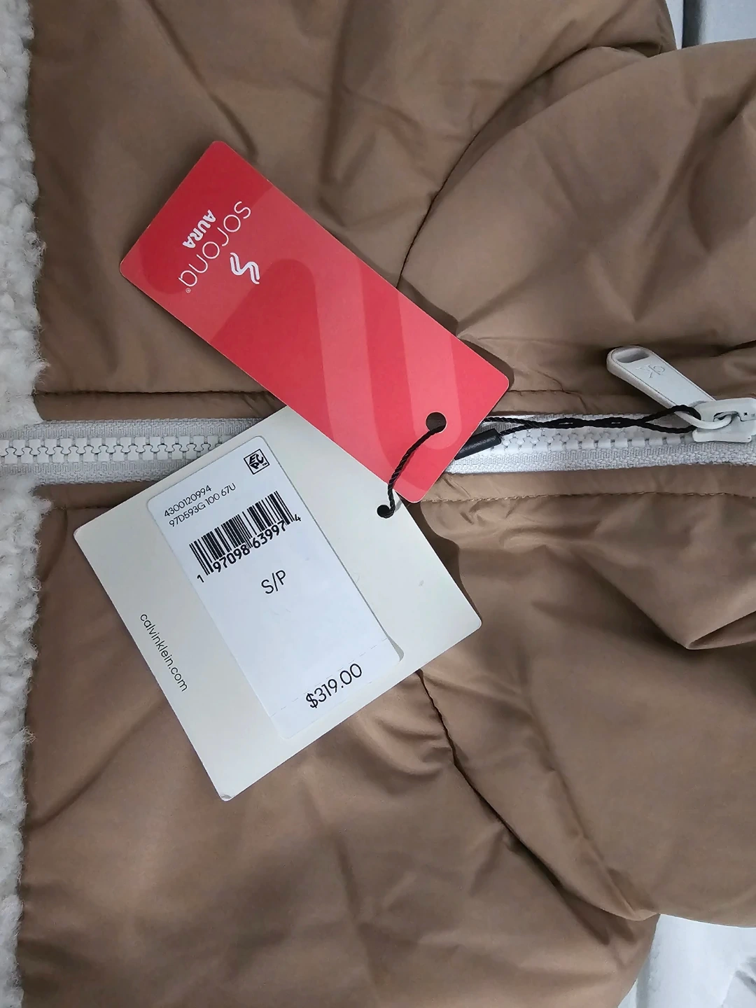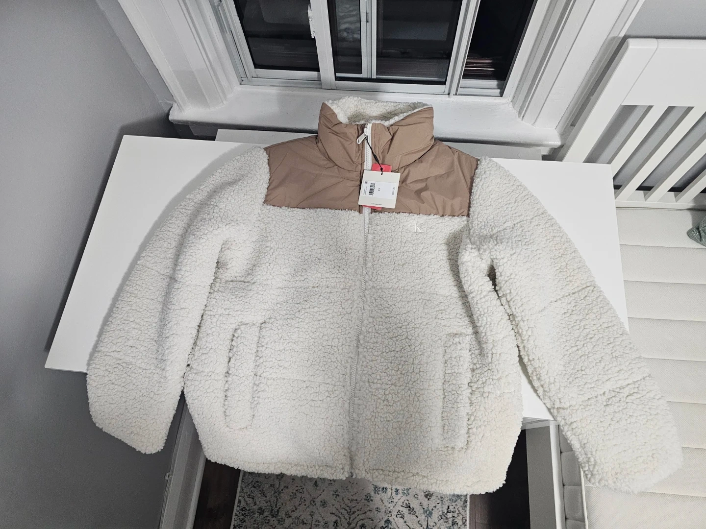 This is a brand new Calvin Klein Sorona Aura sherpa jacket in size small! The jacket is a cream colour with a tan upper section. It's super soft and cozy, perfect for chilly days!