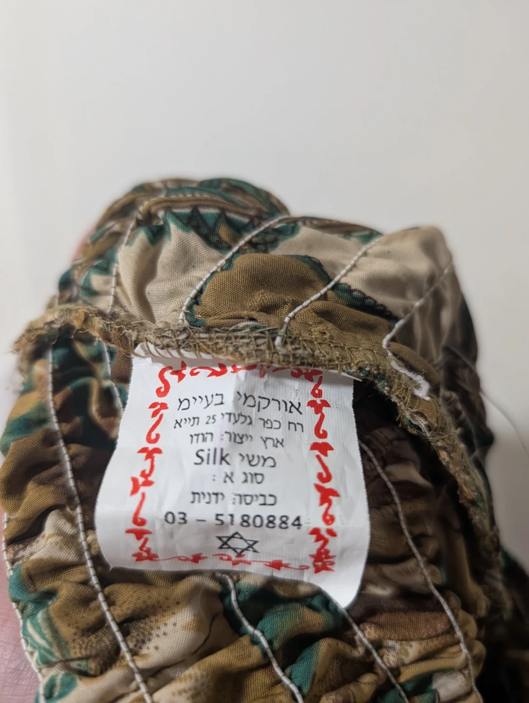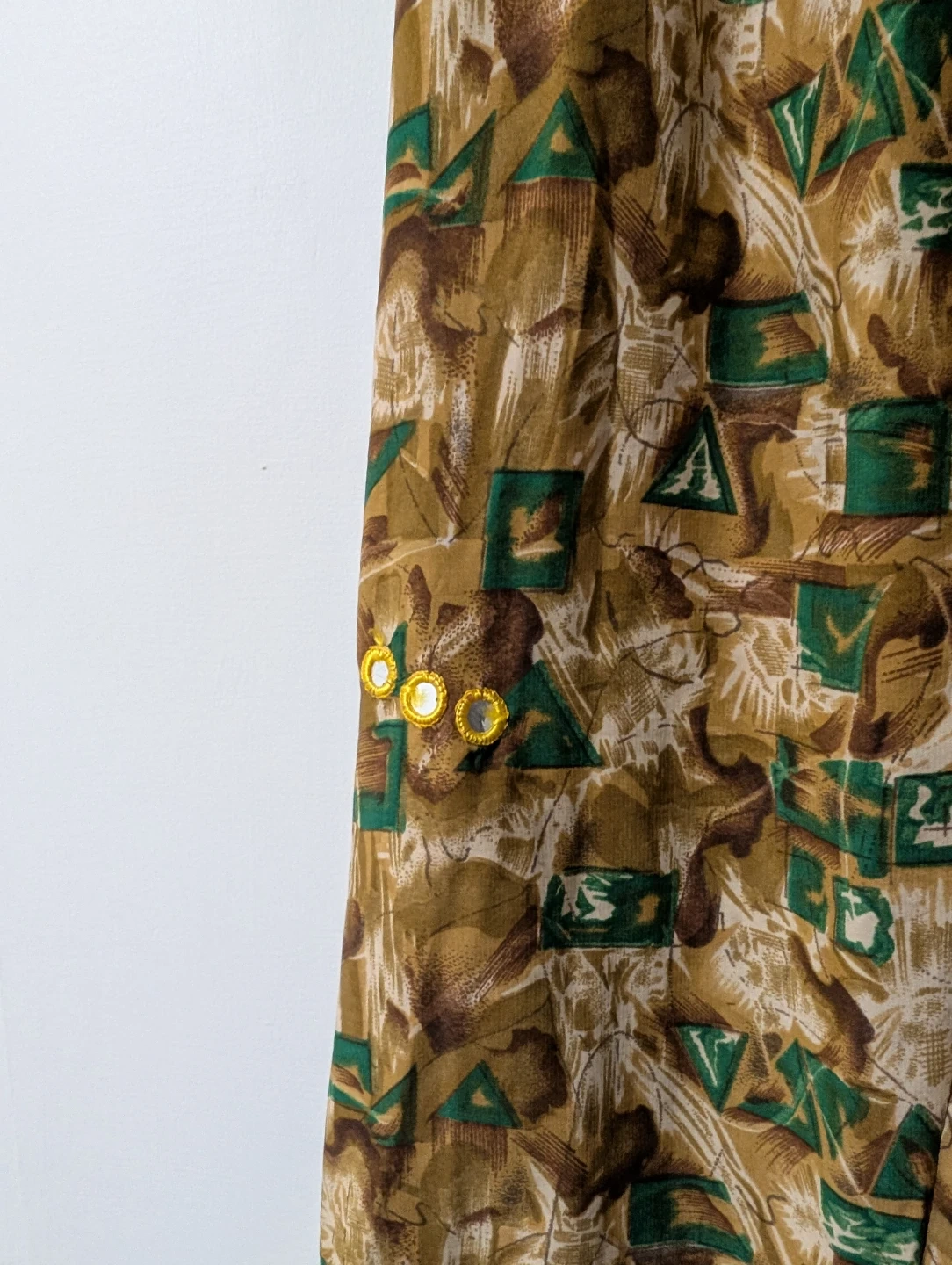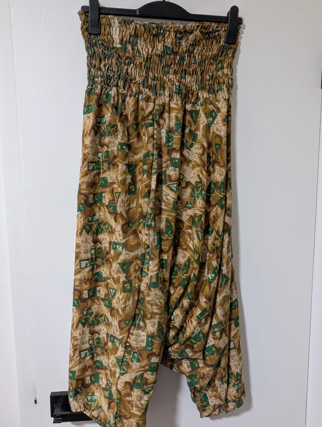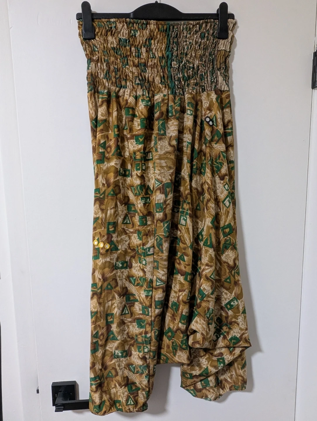 These silk baggy pants have a unique brown and green pattern. Tiny mirrors are Incorporated. They are made of silk and have an elastic waistband.