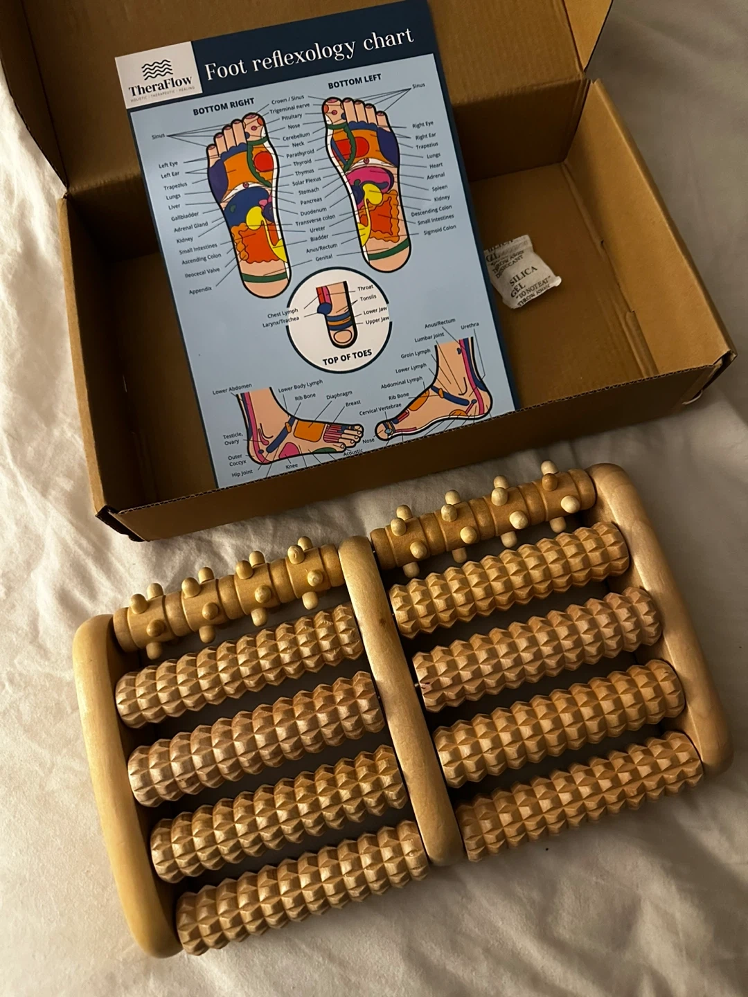 Selling a TheraFlow foot massager roller! It's great for holistic and therapeutic healing. The box is included, and it also comes with a foot reflexology chart. Perfect for relaxing after a long day!