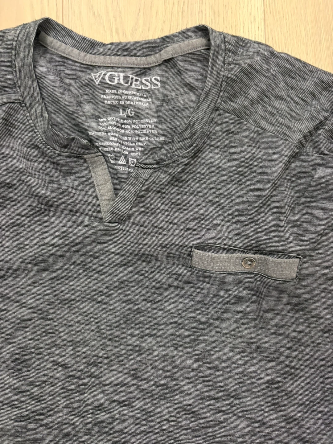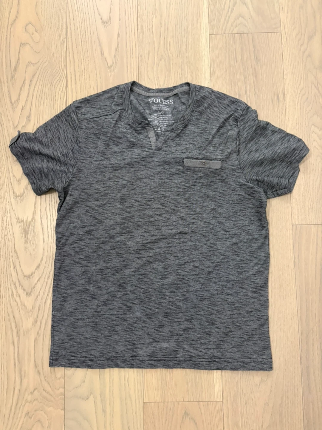 Selling a Guess henley t-shirt in size large. It's a stylish grey colour and perfect for casual wear! It’s in good used condition.
