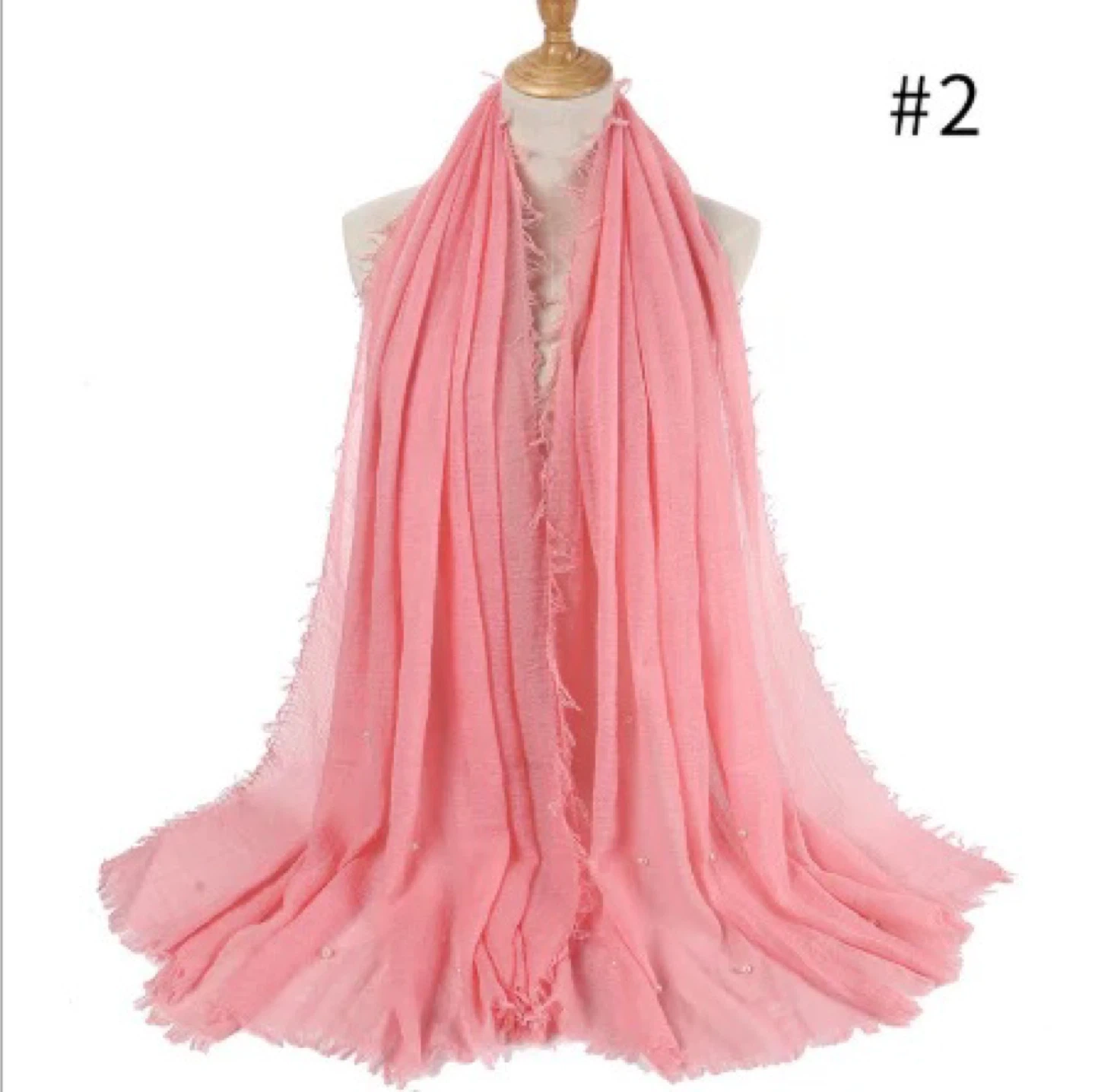 - A lovely pink hijab/shawl/scarf with elegant pearl embellishments.