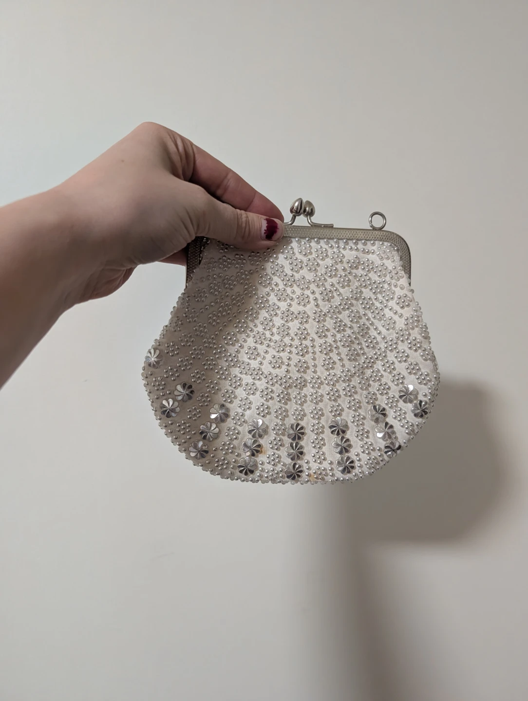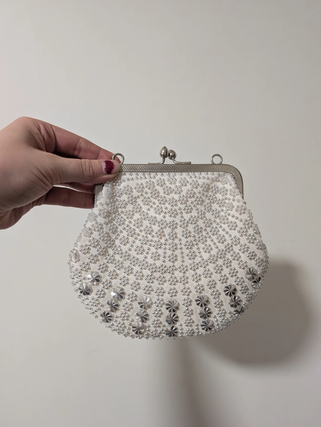 Selling a cute, vintage-style beaded evening bag! It's white with delicate beadwork and a kiss-lock closure. Perfect for a night out or special occasion