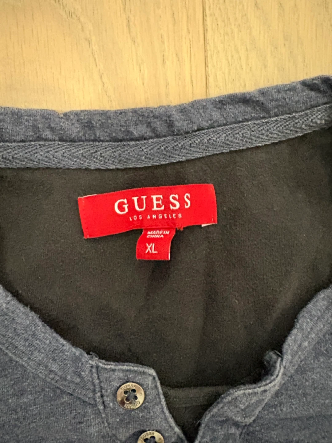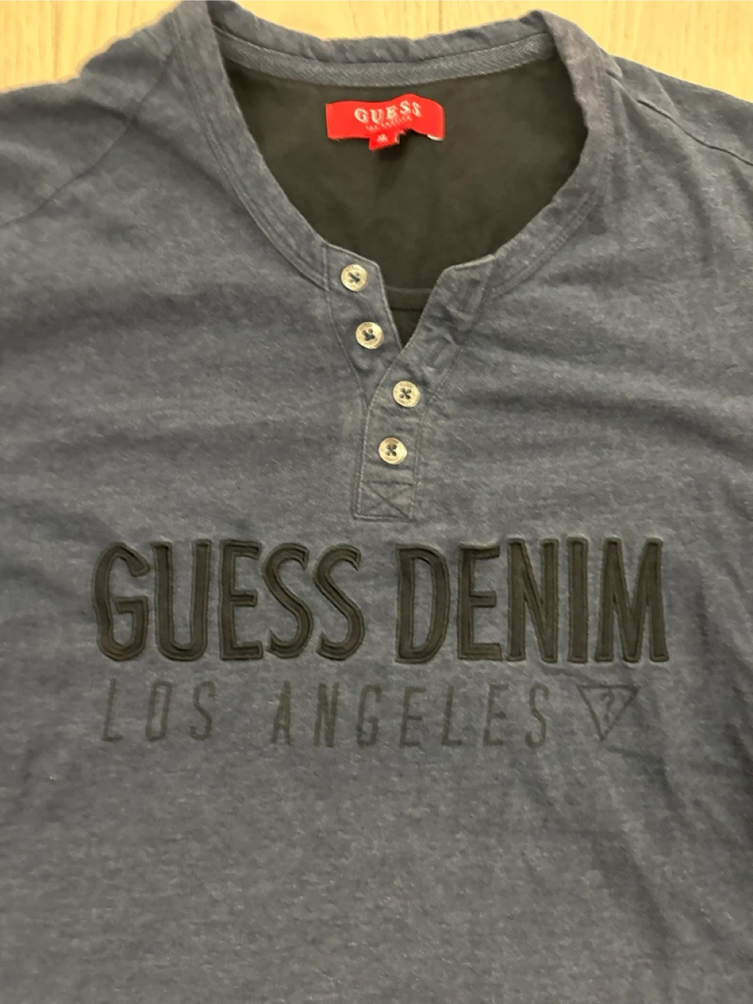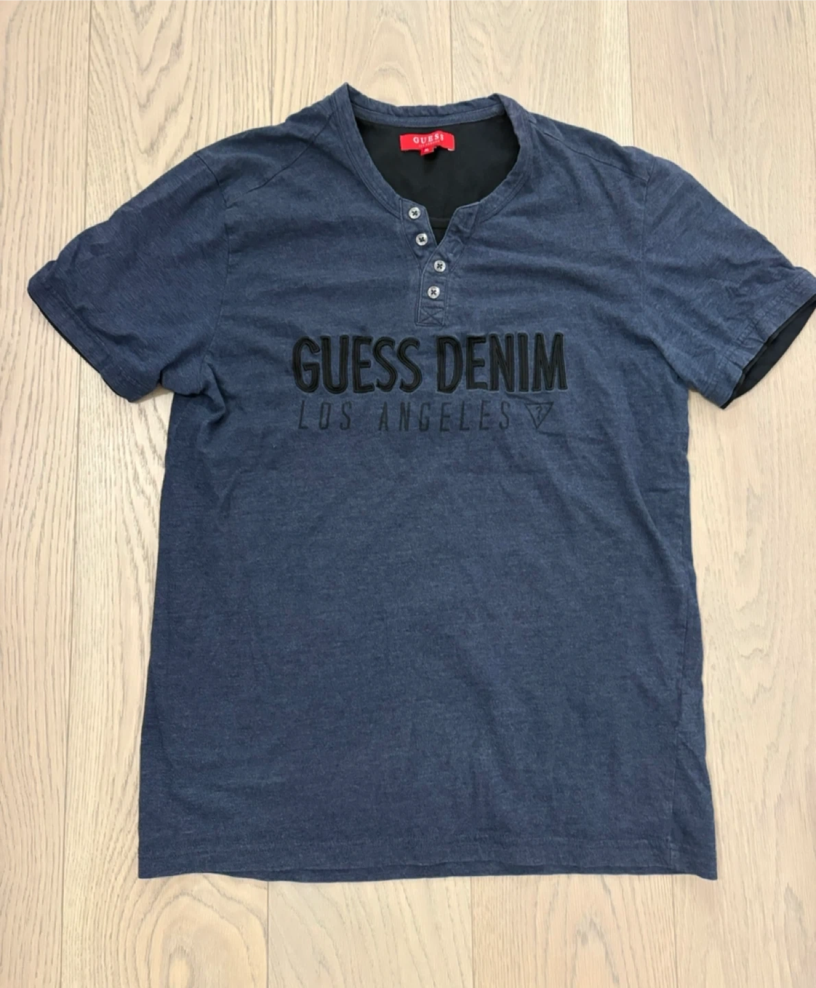 Selling a Guess Denim Los Angeles t-shirt in size XL. It's in good used condition and has a stylish, casual look. The shirt features a button-up design at the collar and the Guess Denim logo across the chest. Perfect for everyday wear!