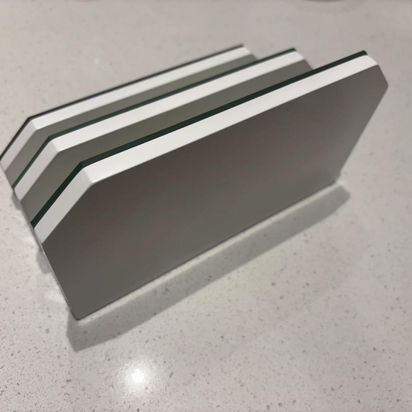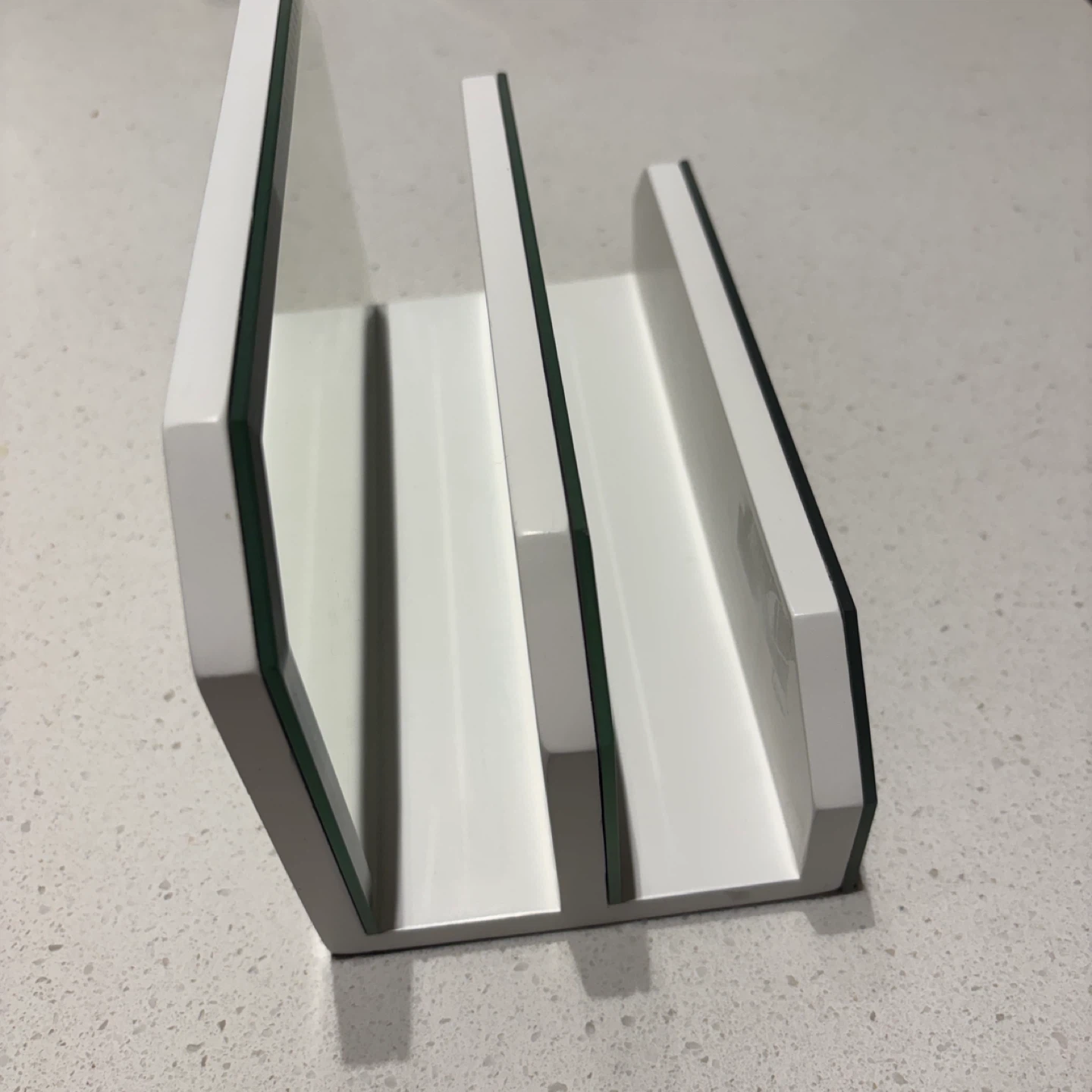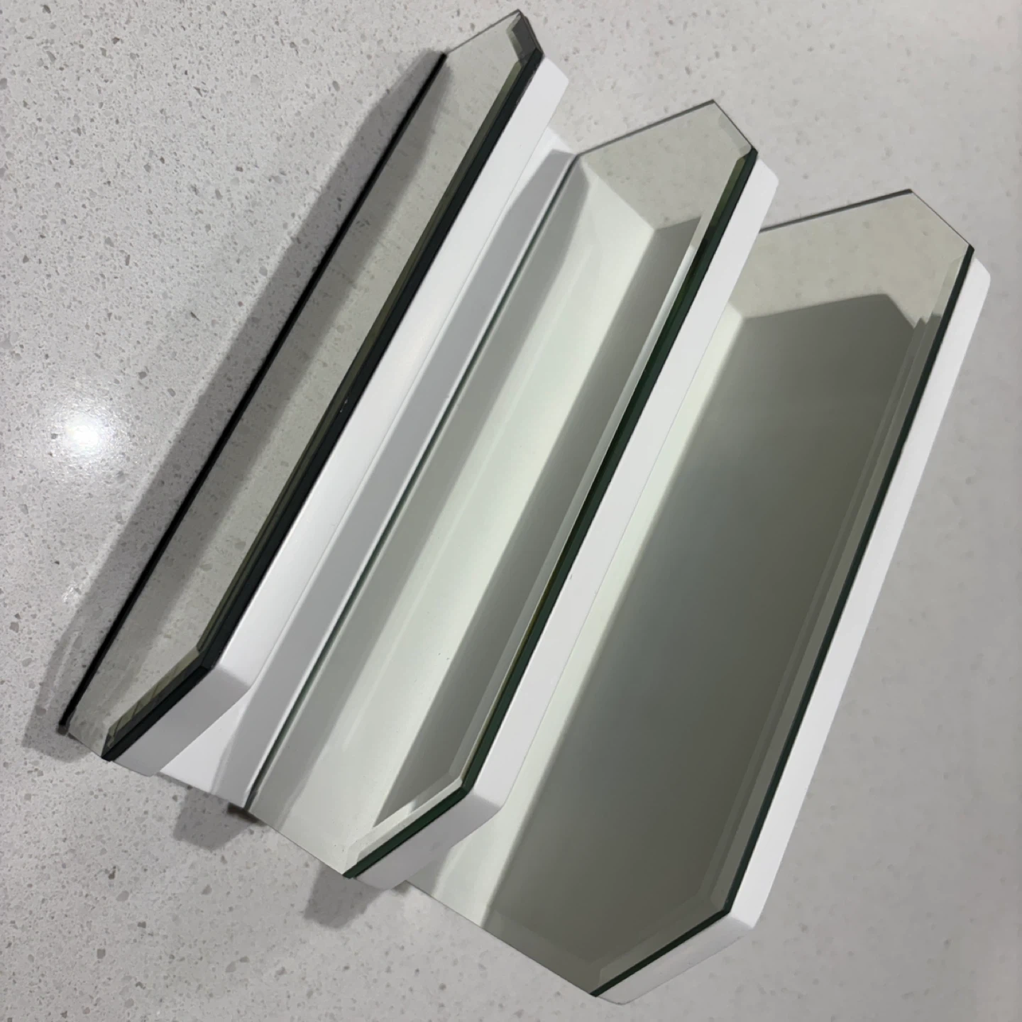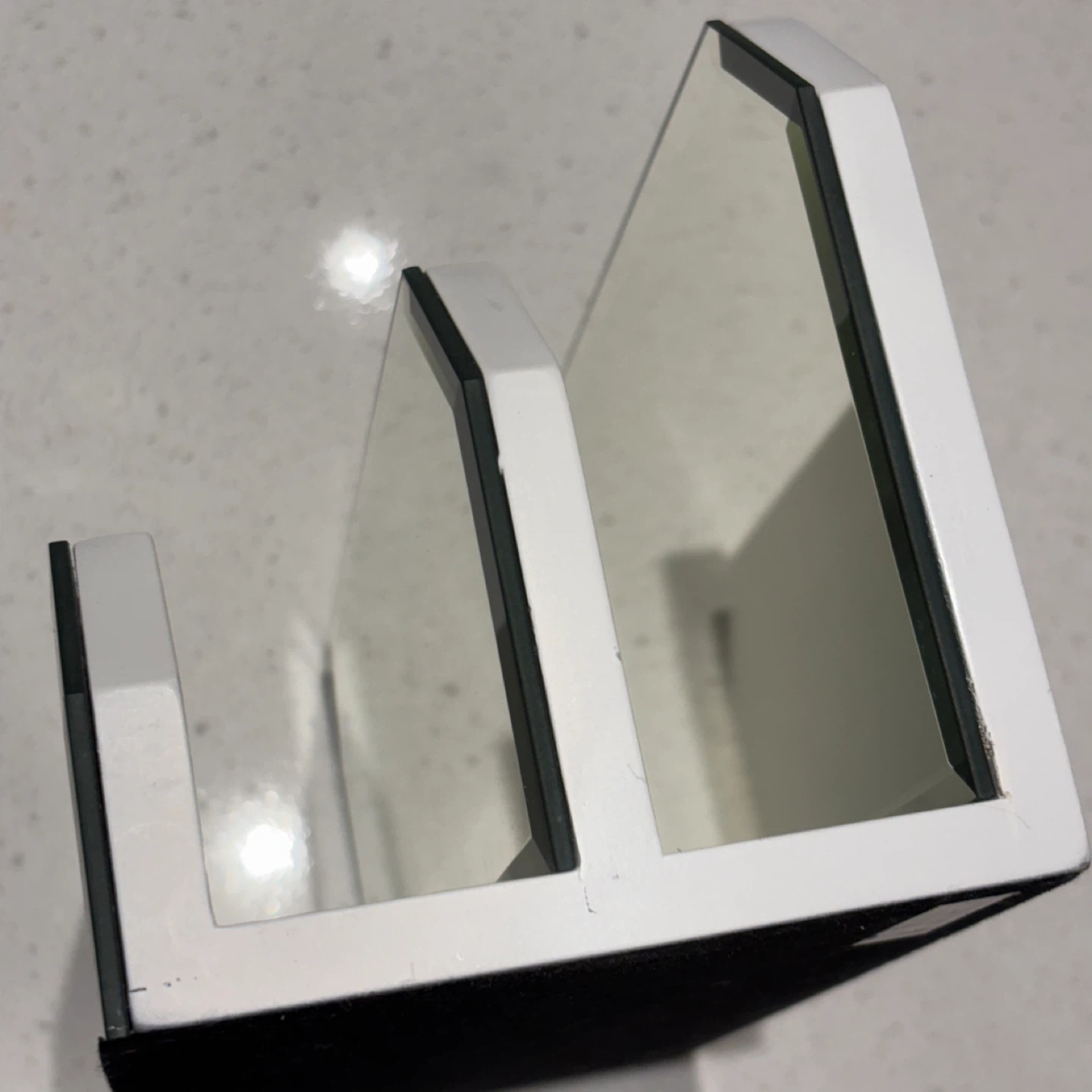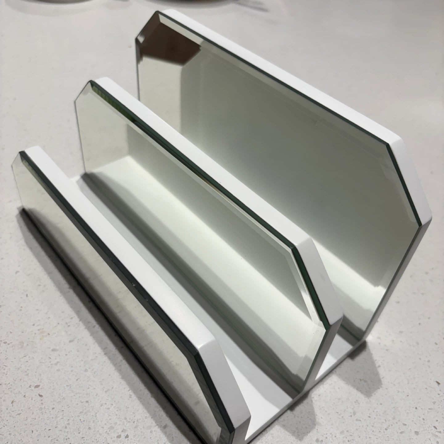 Selling a stylish desktop organizer featuring a white wooden frame and mirror dividers. It's perfect for keeping your workspace tidy and adding a modern touch to your desk.