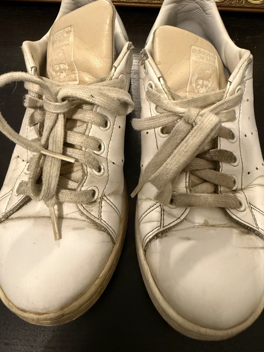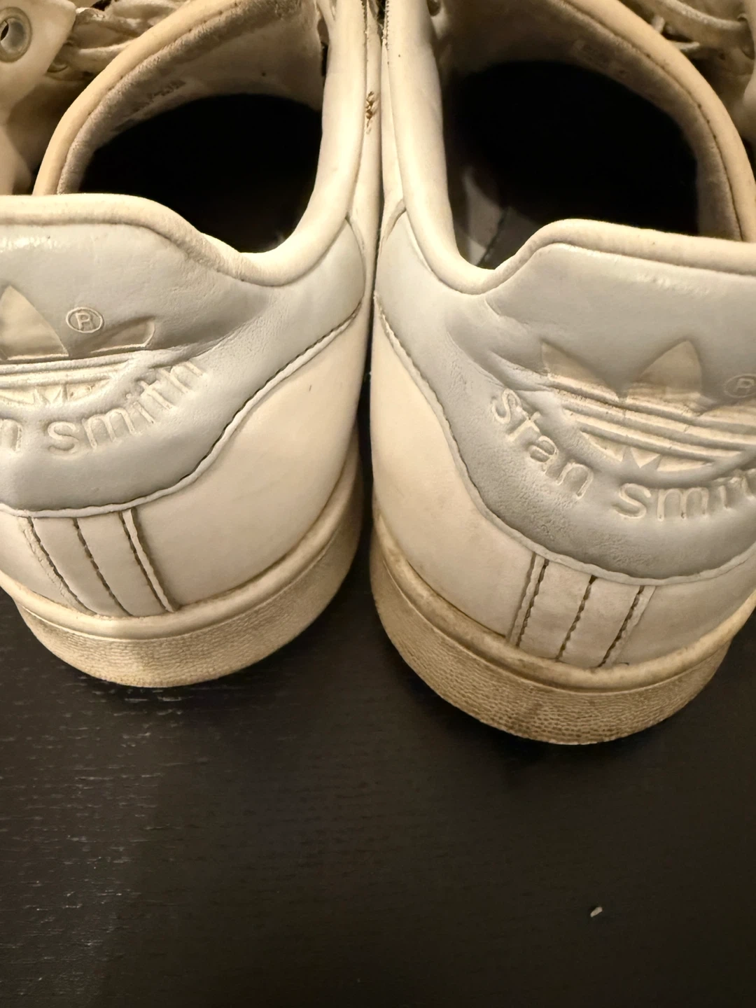 Selling a pair of Adidas Stan Smith sneakers in white. They're a size 7.5 in US women's sizing. These classic sneakers have a timeless style and are perfect for everyday wear. They do show some signs of wear, but still have plenty of life left!