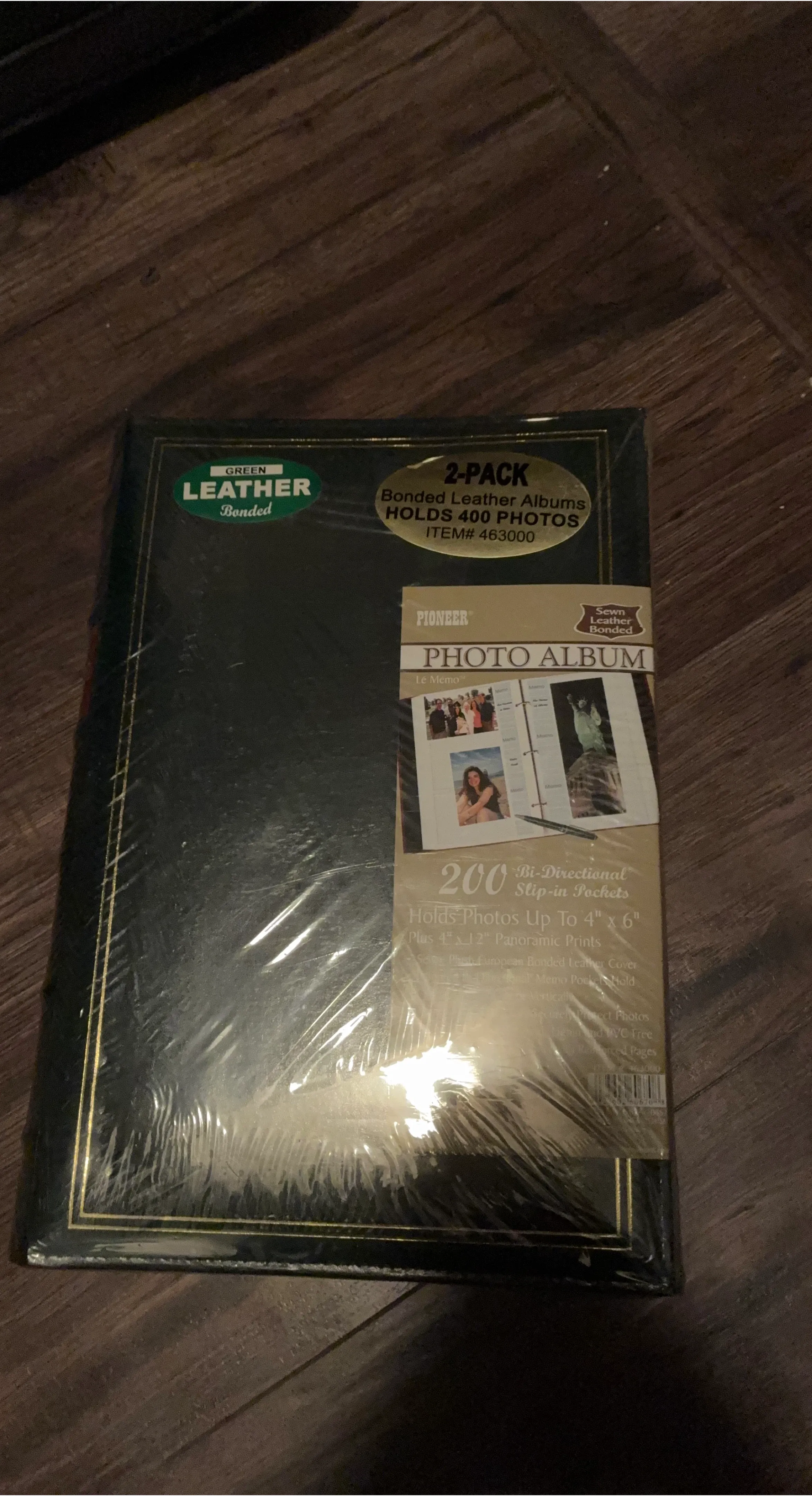 Selling a new 2-pack of Pioneer bonded leather photo albums. These albums can hold up to 400 photos. Each album features 200 bi-directional slip-in pockets, perfect for photos up to 4" x 6", plus 4" x 12" panoramic prints. They also have sewn European bonded leather covers and memo pockets