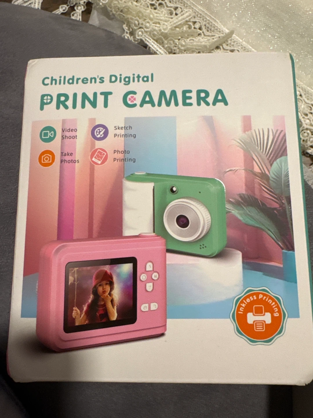 Selling a children's digital print camera! It's in great condition and comes in its original box. It features video shoot, sketch printing, photo printing, and takes photos. Plus, it has inkless printing, so no need to worry about ink cartridges!