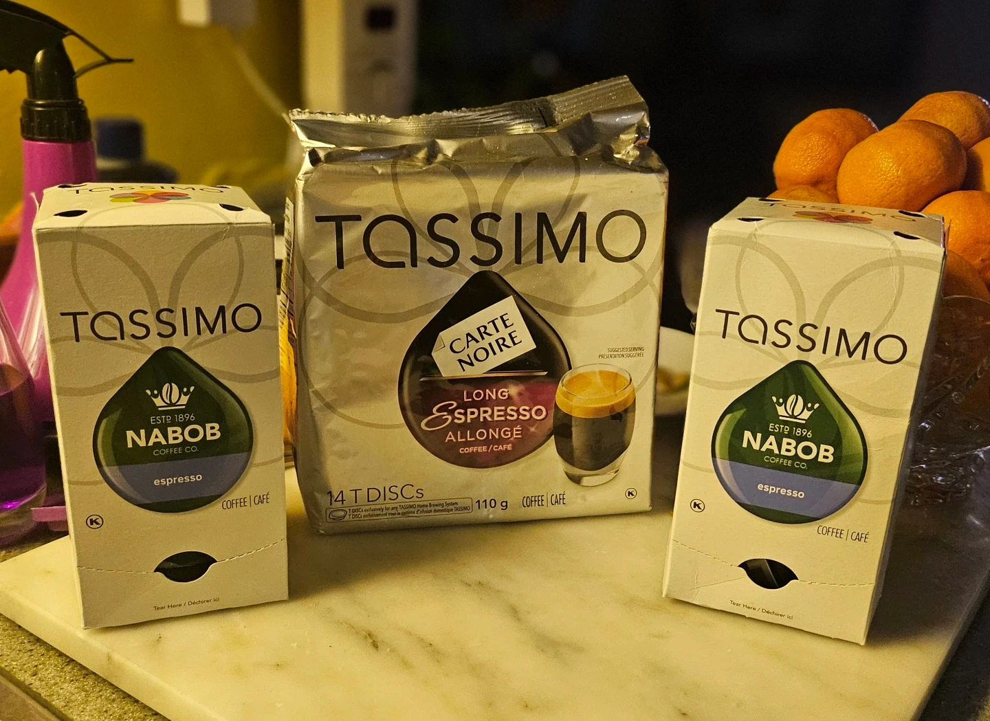Tassimo coffee pods! I have Nabob Espresso (13 T-discs) and Carte Noire Long Espresso, package is still sealed (contains 14 T-Discs) for your Tassimo coffee machine. Perfect for a quick and delicious espresso or a longer, more intense coffee experience.