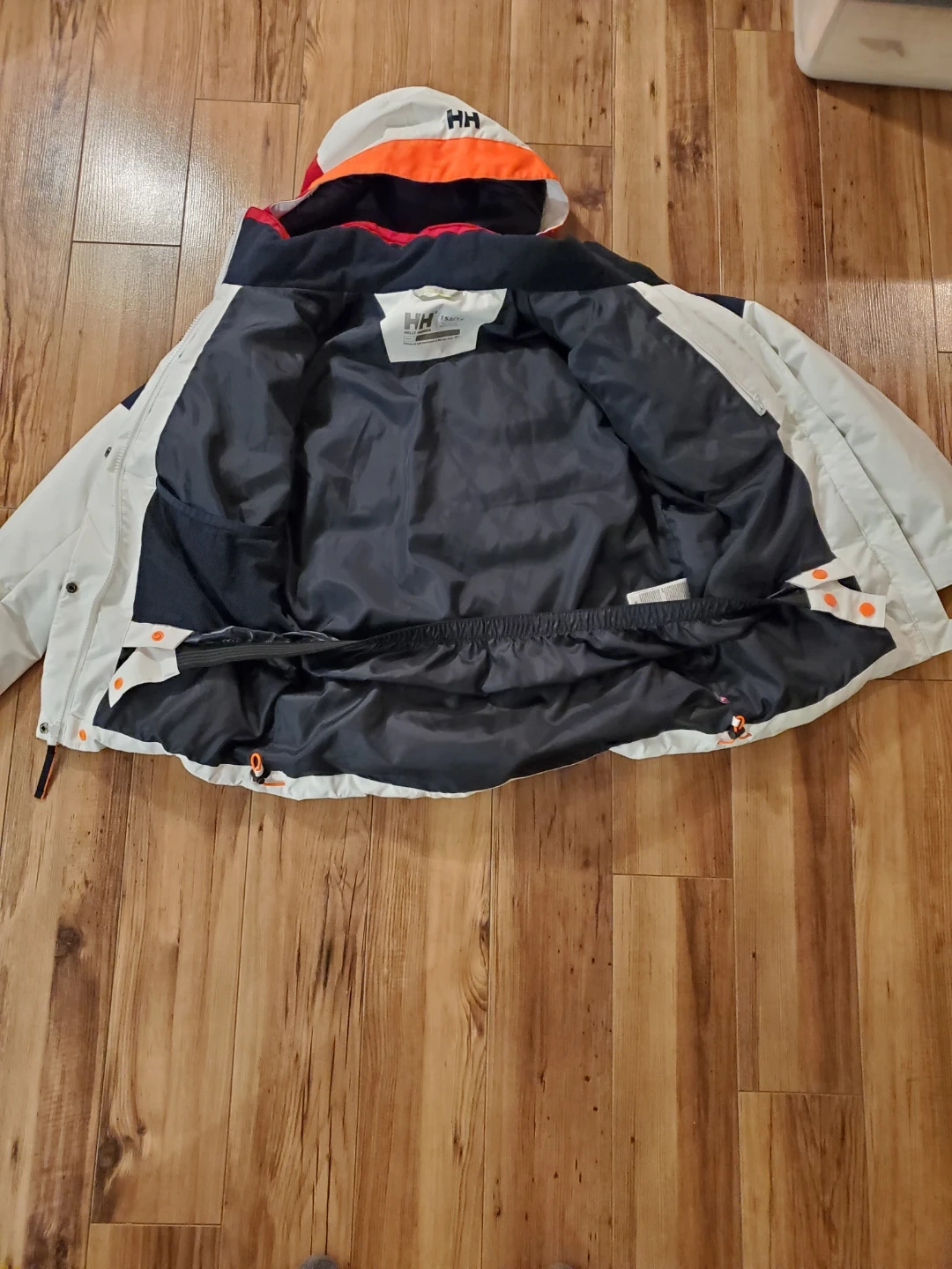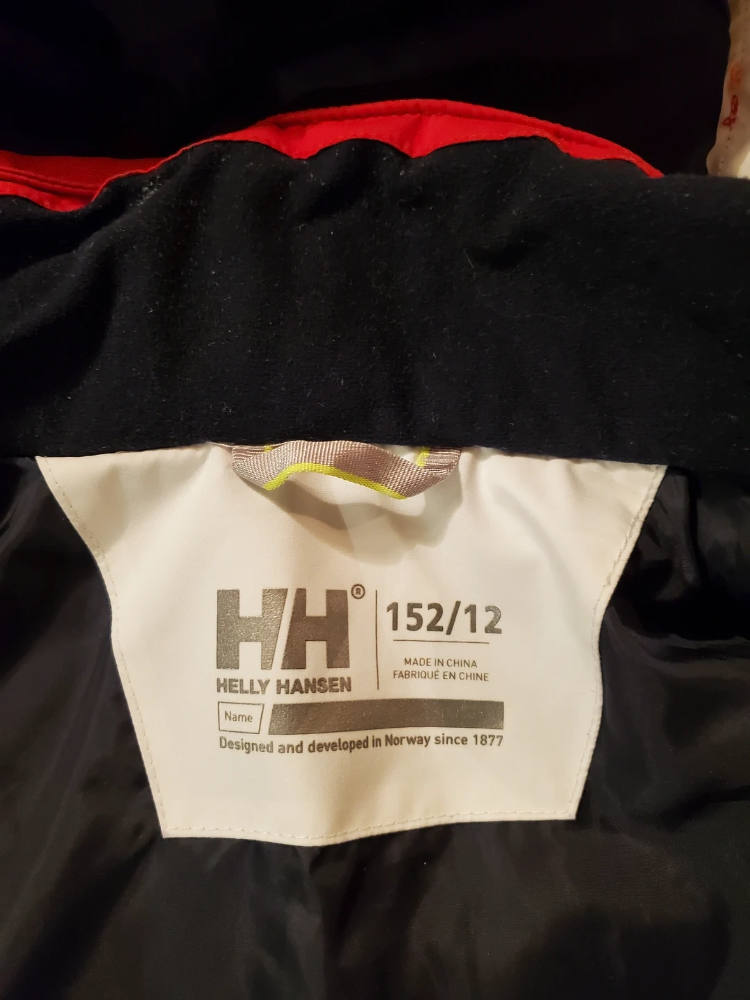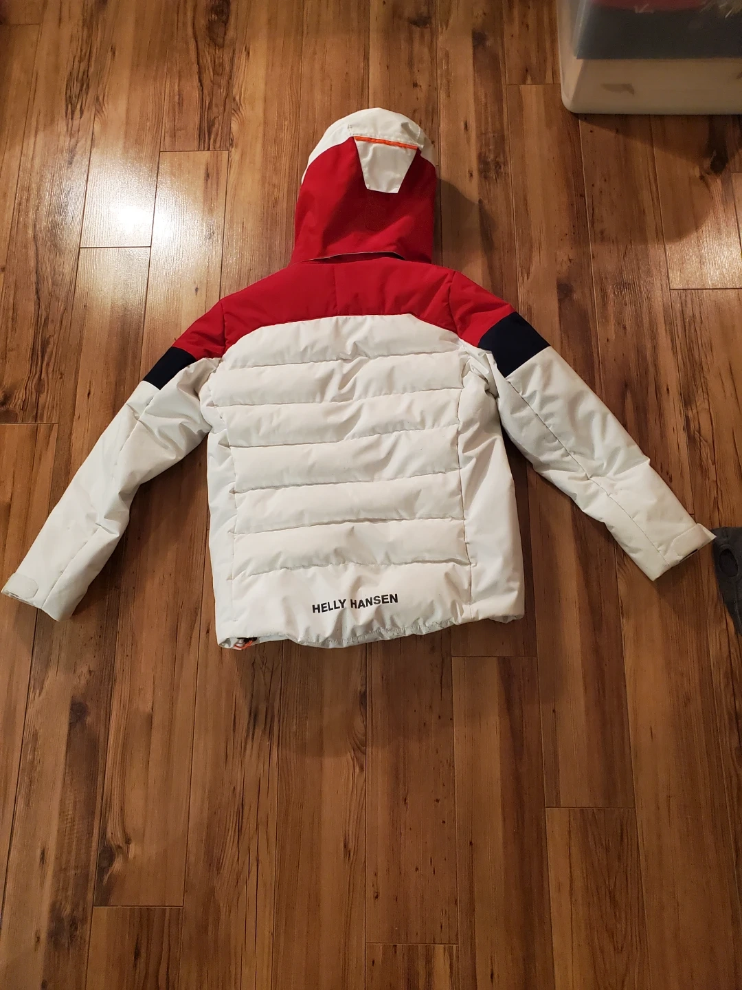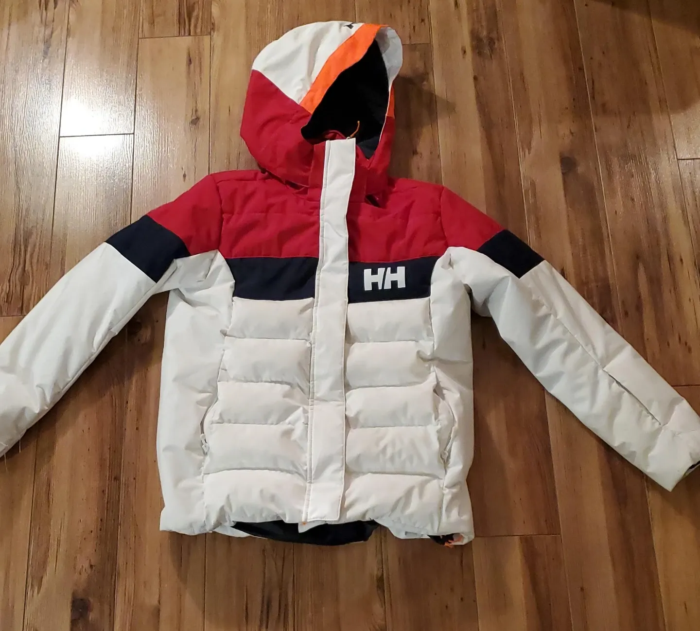 Helly Hansen padded jacket, size 152/12. The jacket is white, red, and navy. The brand logo is on the front. It's designed and developed in Norway since 1877. There are very few, very minor stains that could be removed!