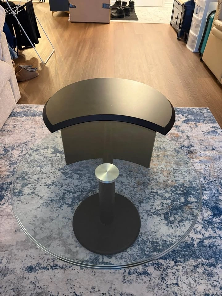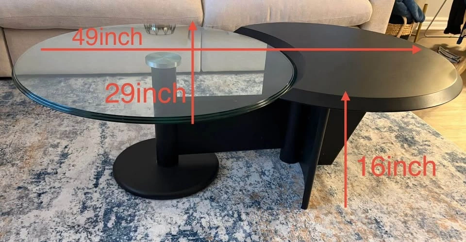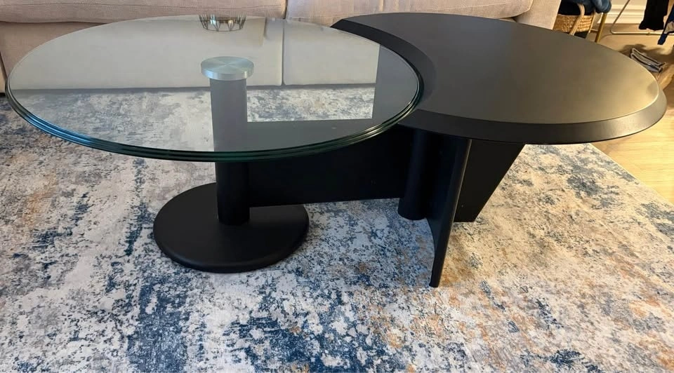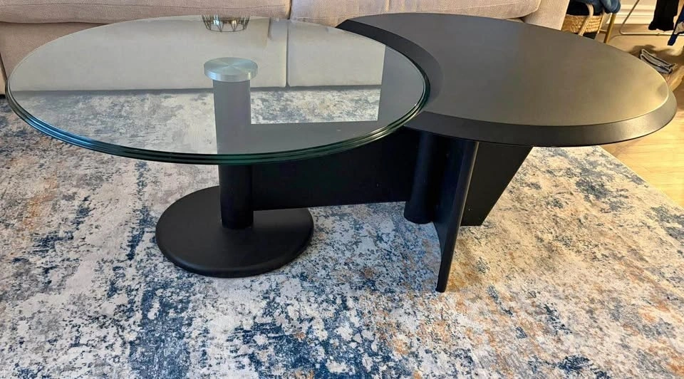 Beautiful modern coffee table with a unique rotating glass top that turns. Super practical and a real statement piece.