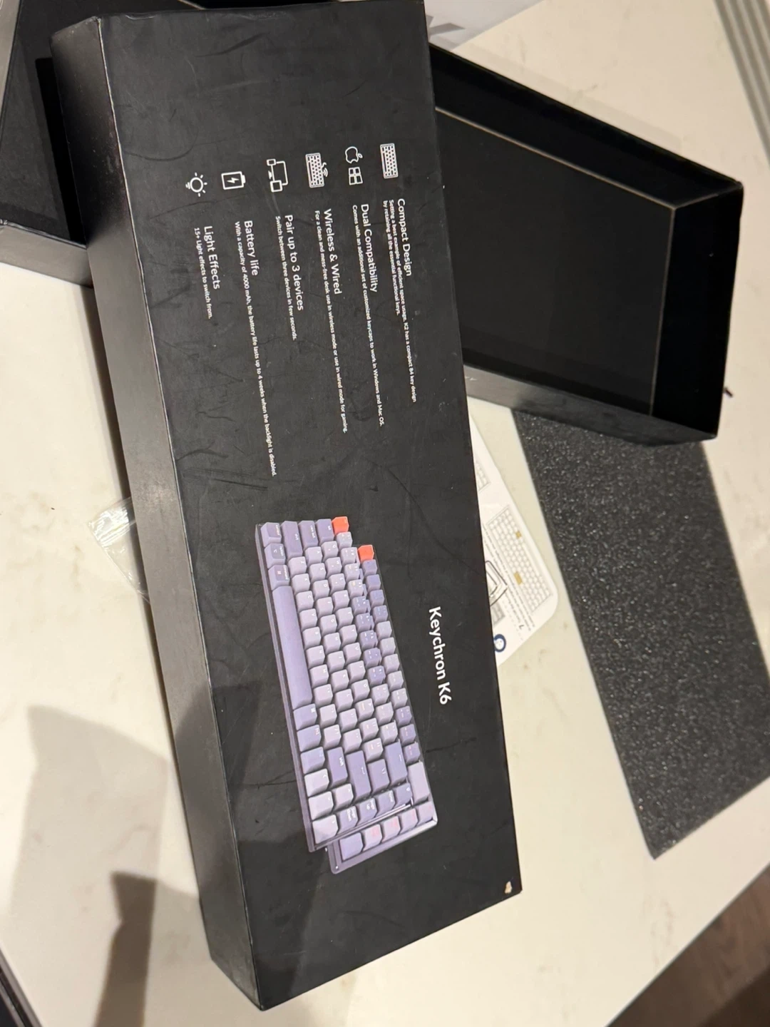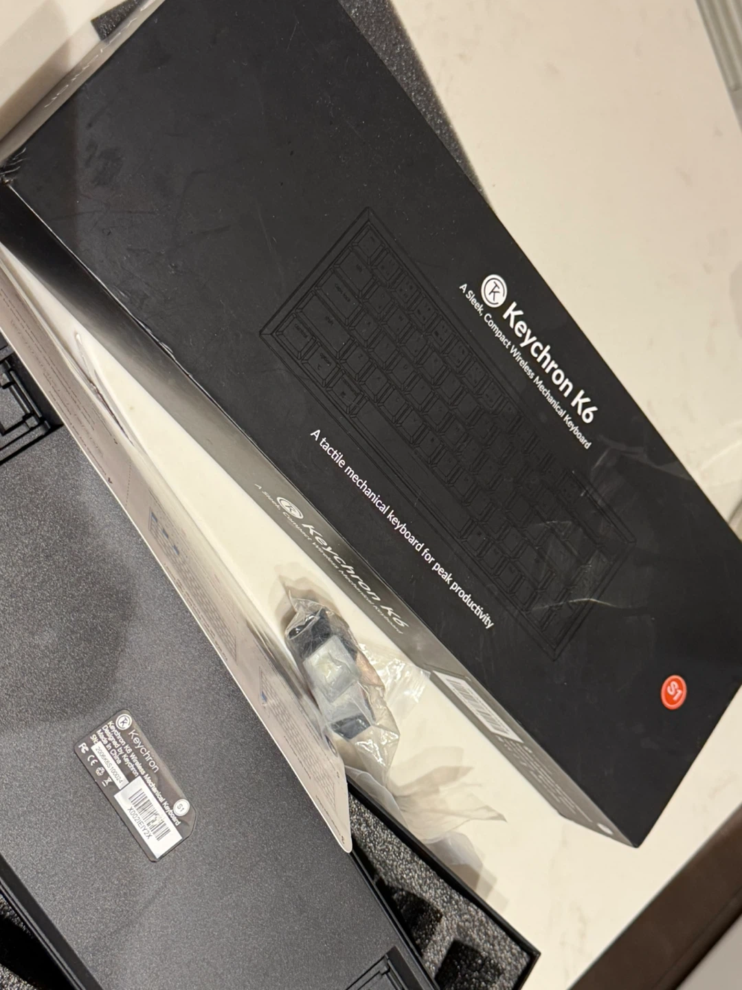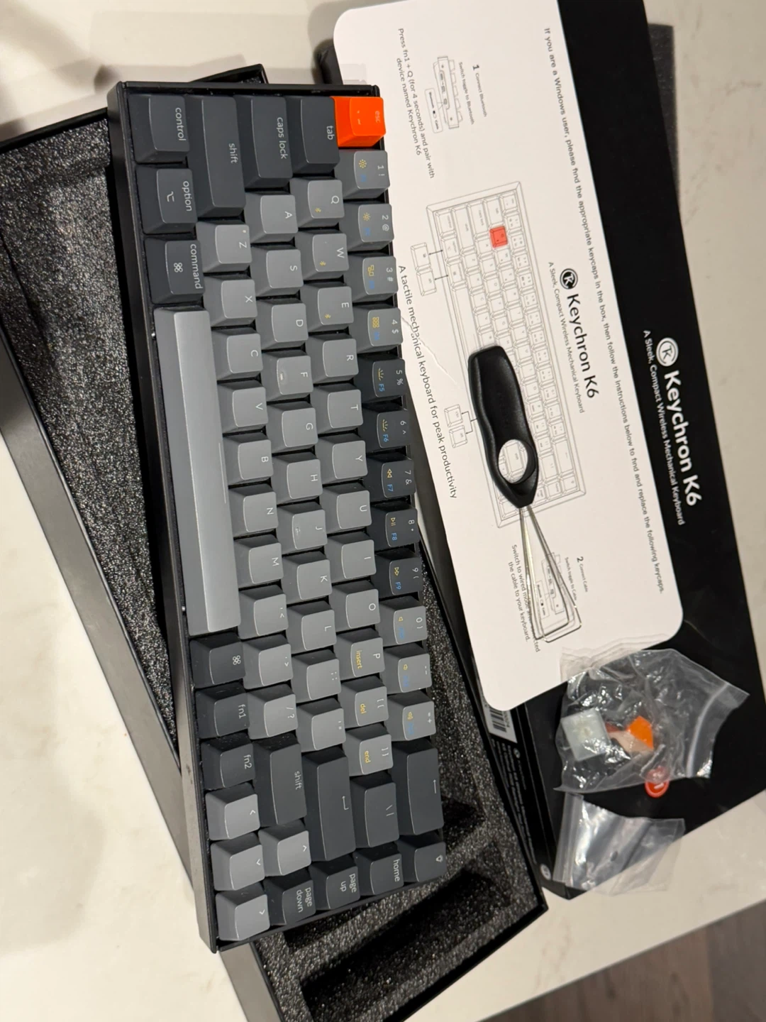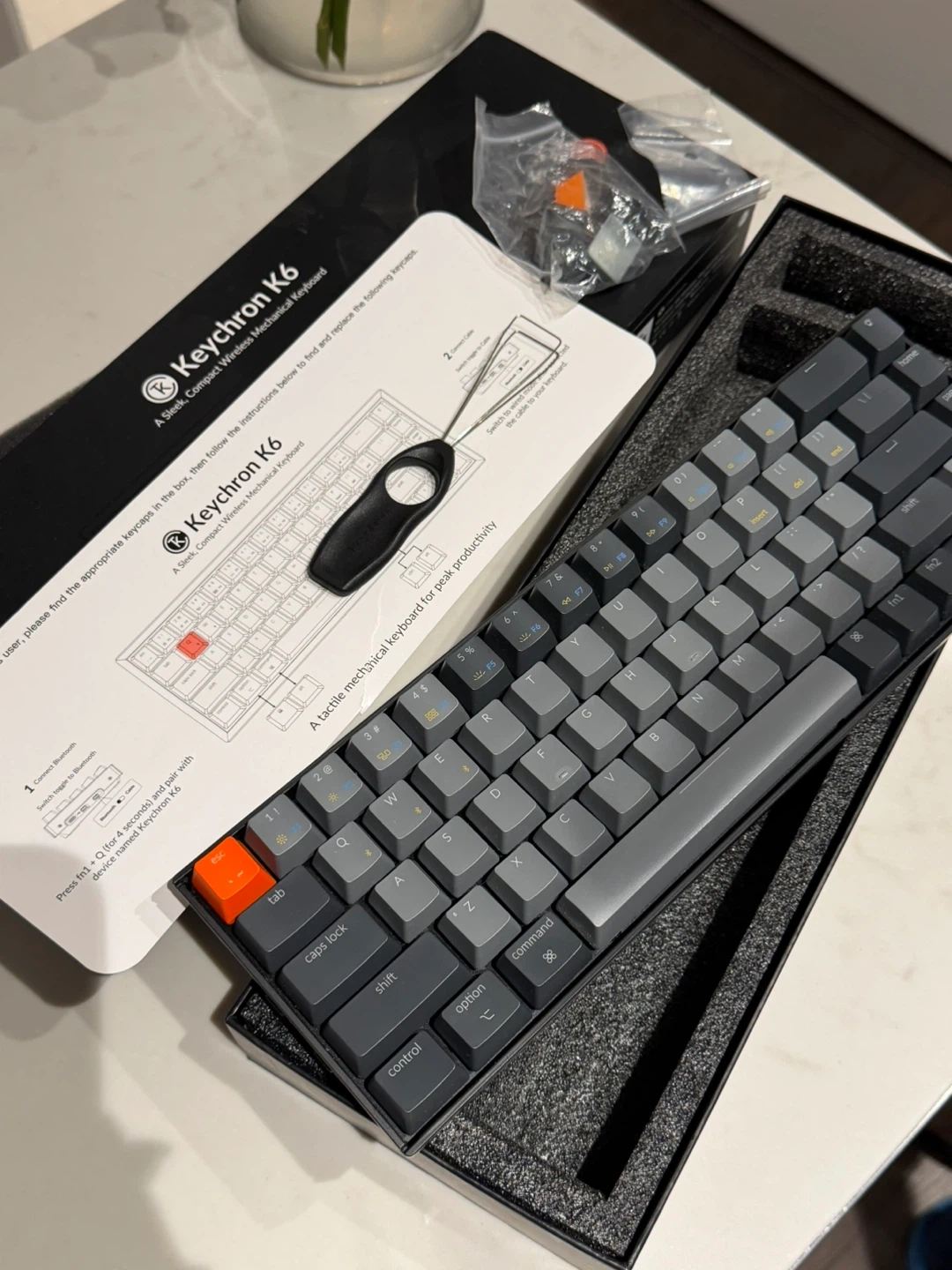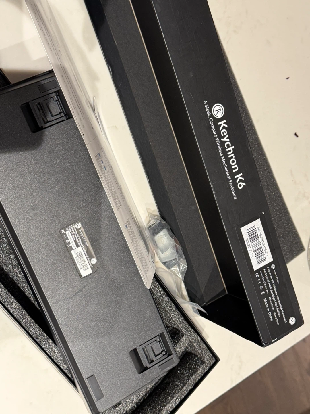 Selling a Keychron K6, a sleek and compact wireless mechanical keyboard! It's in like-new condition and comes with its original box. This tactile mechanical keyboard is designed for peak productivity. It also has dual compatibility, meaning it can be used wirelessly or wired. Great for pairing up to 3 devices!